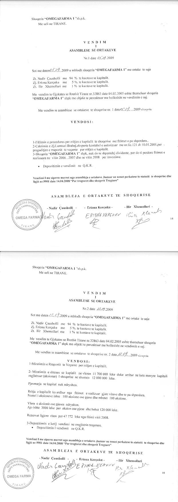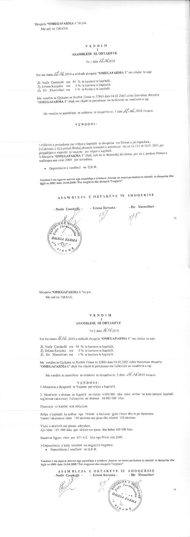 | Çështje Ligjore: | Me date 05.03.2012, eshte depozituar Marreveshja e Bashkimit me përthithje te shoqerise ''OMEGAFARMA 1'' shpk ( e cila eshte shoqëria e përthithur)nga shoqeria perthithese "OMEGA PHARMA GROUP" shpk. |