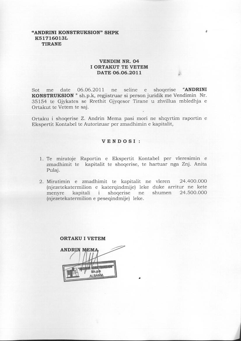 → Ekstrakt Historik i Regjistrit Tregtar date 30.05.2024 → Akt themelimi dhe Statuti i Shoqerise → Vendim i Ortakut të Vetëm, Zmadhim Kapitali datë 06.06.2011 → Vendim i Ortakut të Vetëm, Zmadhim Kapitali datë 21.12.2016 → Vendim i Ortakut të Vetëm, Zvogëlim Kapitali datë 10.06.2019 → Kontratë Shitje Kuotash Kapitali datë 01.03.2021 |