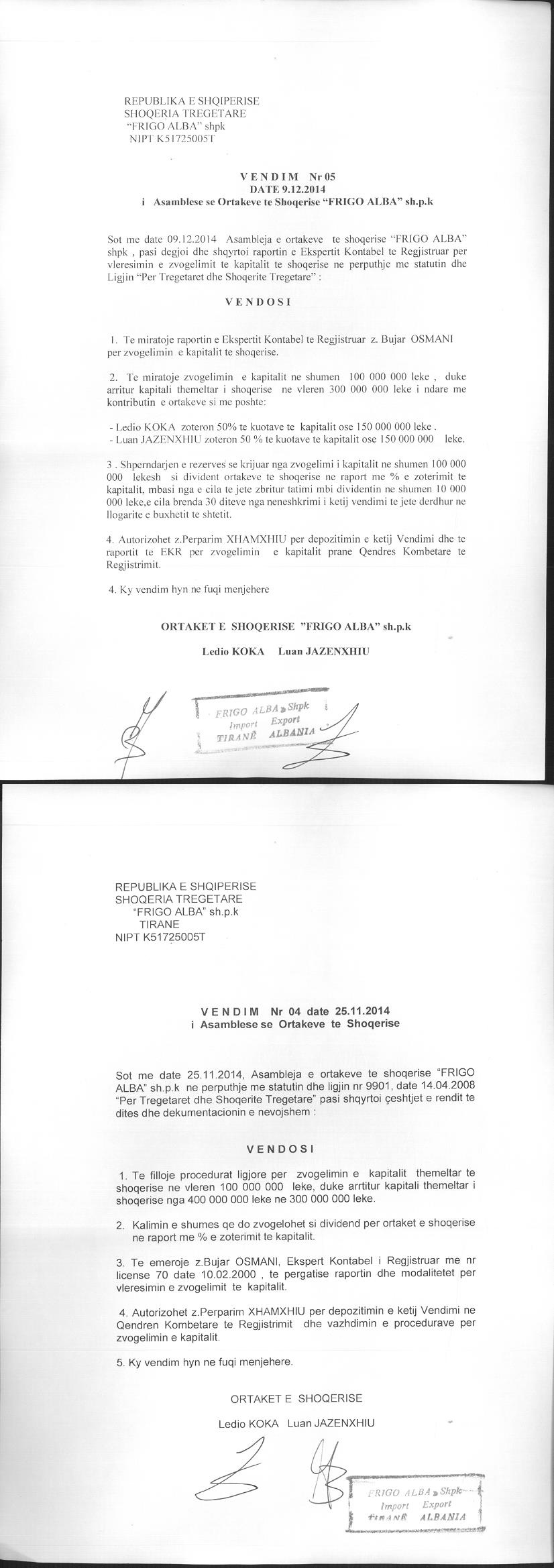 Vendim i asamblese se ortakeve per zvogelimin e kapitalit 09.12.2014