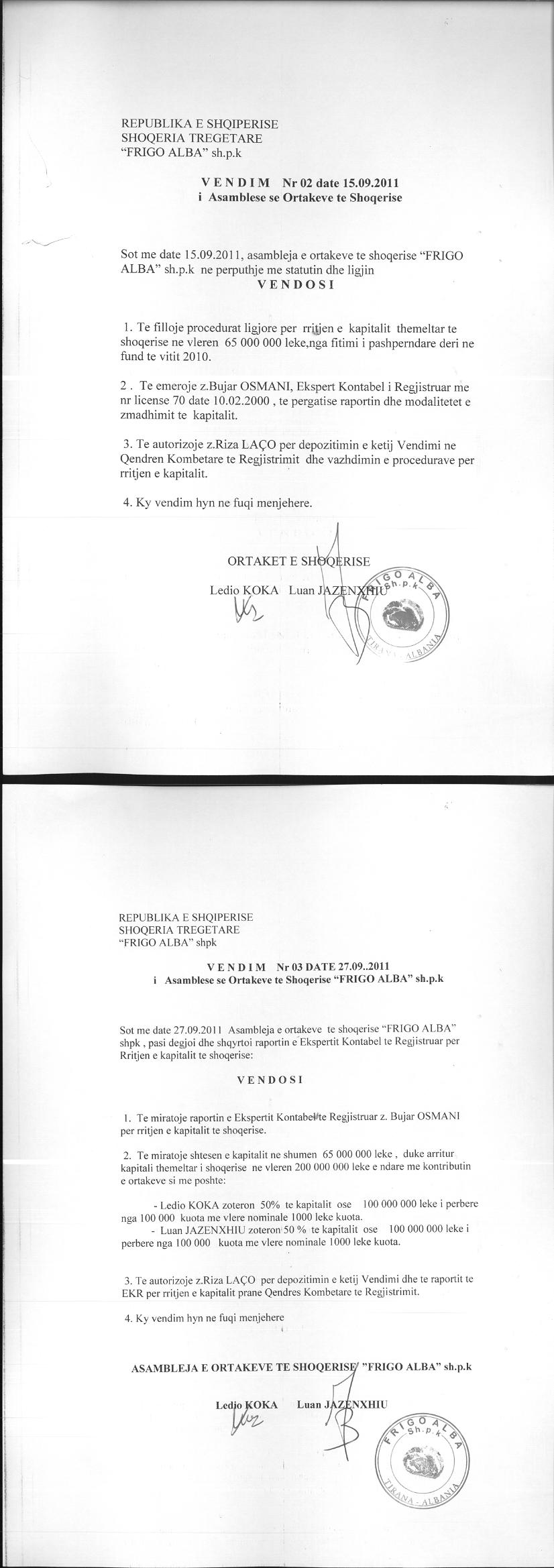 Vendim i asamblese se ortakeve per zmadhimin e kapitalit 15.09.2011
