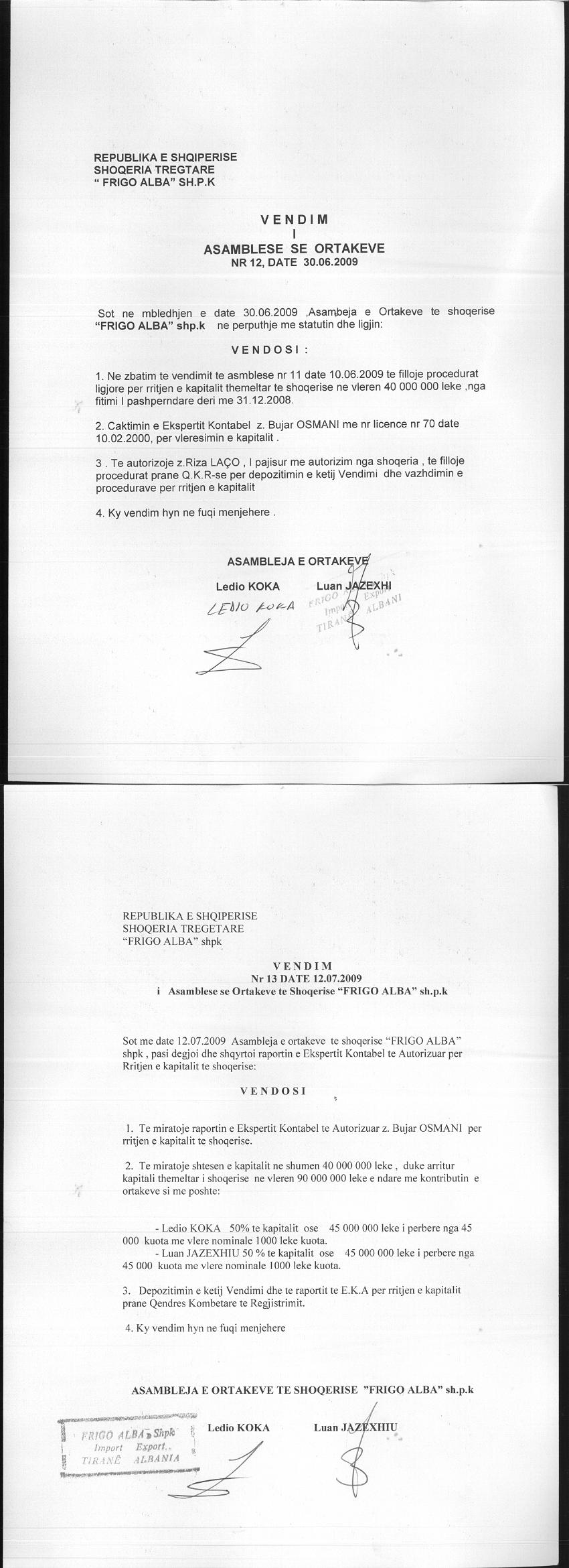 Vendim i asamblese se ortakeve per rritjen e kapitalit 30.06.2009