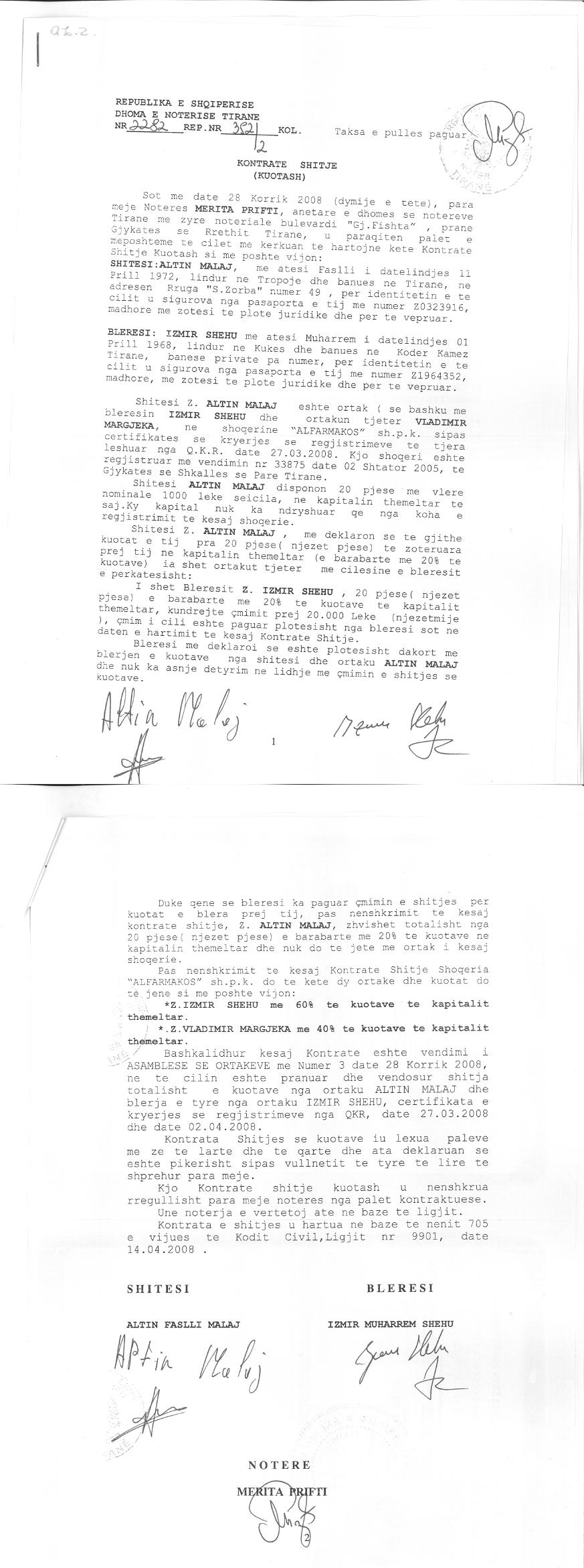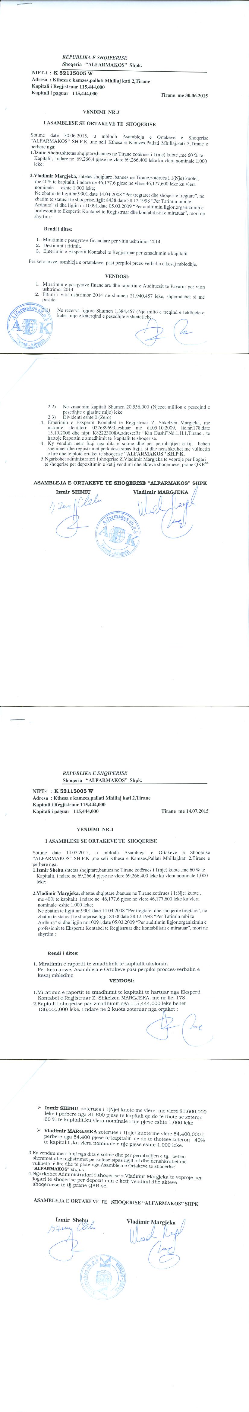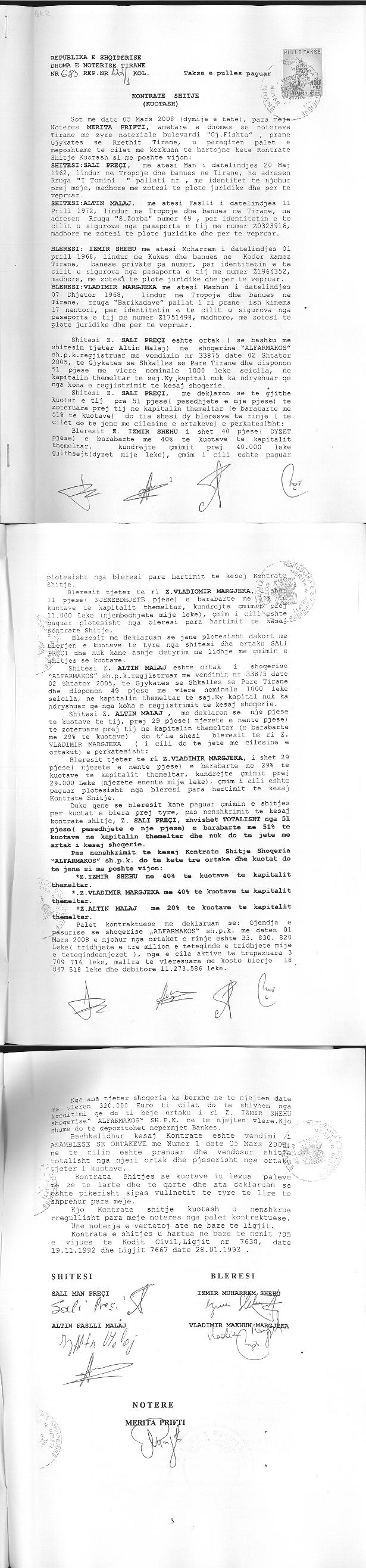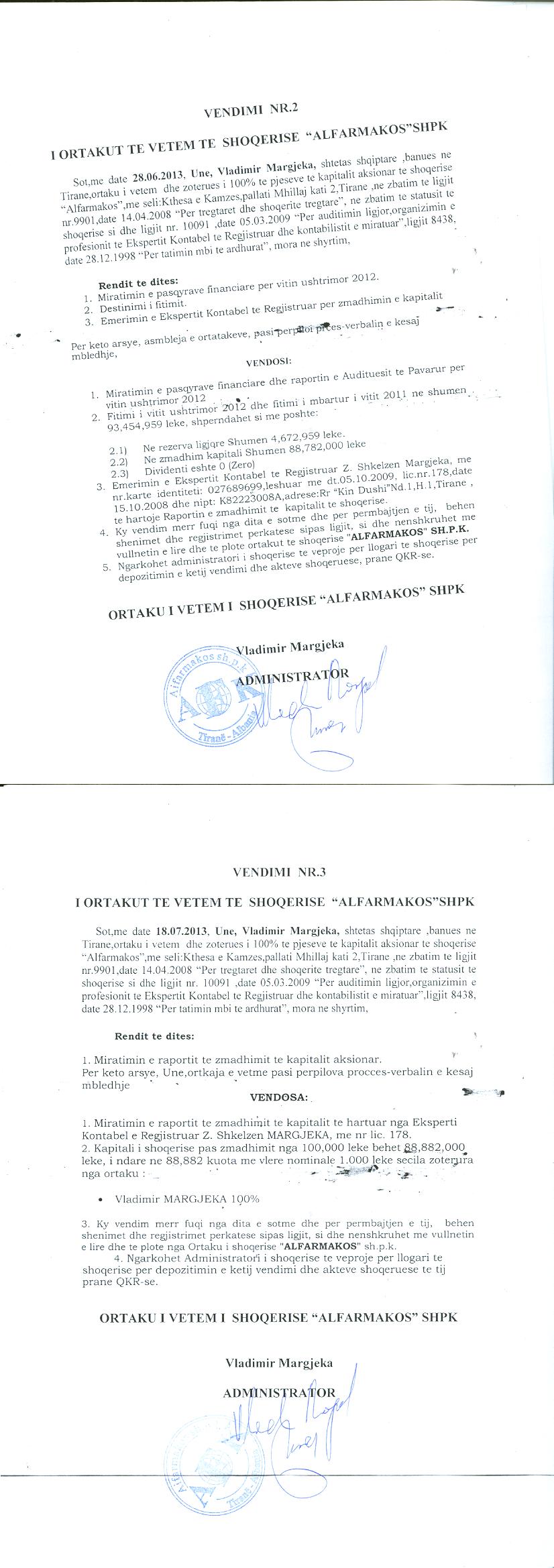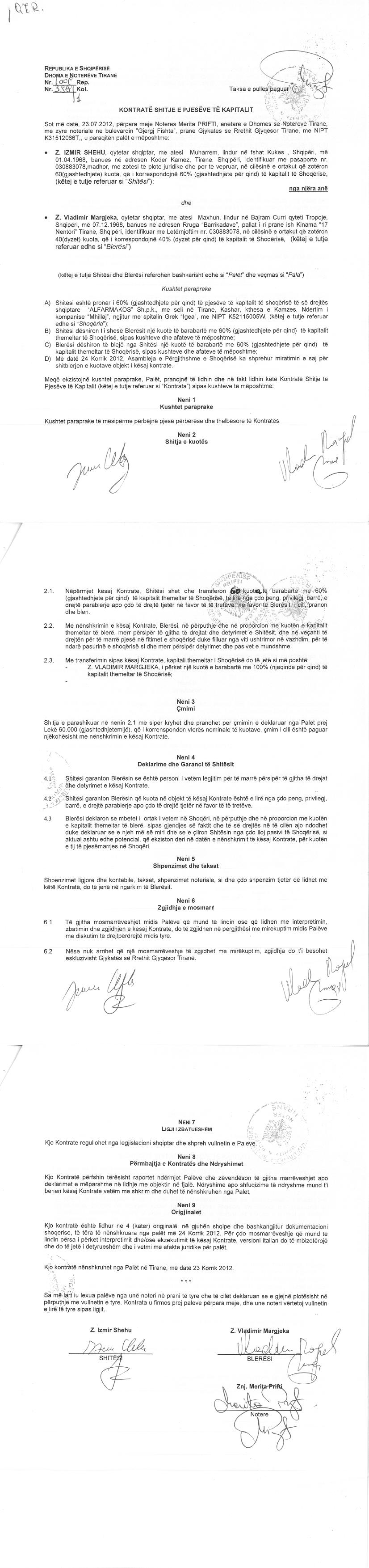 → Ekstrakt historik i regjistrit tregtar 29.11.2023 → Akti i themelimit → Vendimi i asamblese se ortakeve per zmadhimin e kapitalit 30.06.2018 → Kontrate shitblerje kuotash dhe kapitali 25.04.2015 → Kontrate shitje kuotash 28.07.2008 → Kontrate shitje e pjeseve te kapitalit 23.07.2012 → Kontrate shitje kuotash 05.03.2008 → Vendim i ortakut te vetem per zmadhimin e kapitalit 28.06.2013 → Vendim i ortakut te vetem per rritjen e kapitalit 14.06.2014 → Vendim i asamblese se ortakeve per rritjen e kapitalit 30.06.2015 |