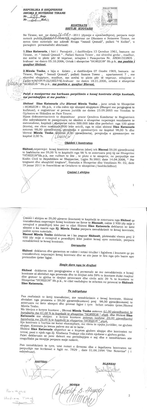 | Çështje Ligjore: | I. Me date 21.12.2012, me ane te njoftimit “Per vendimit e sugurimit te padise” Nr.117/1, leshuar nga zyra permbarimore Kozeta Caka, u urdherua Qendra Kombetare e Regjistrimit qe te mos kryeje asnje veprim tjetersimi te kuotave per shoqerine “Horizon”, deri ne shqyrtimin perfundimtar te padise se themelit me vendim perfundimtar. II. Me date 19.03.2015, me ane te Vendimit Nr.117/9 Prot, Nr.117 Dosje, lëshuar nga Zyra Përmbarimore Private “Kozeta Caka”, drejtuar QKR, u vendos pushimi i ekzekutimit te Vendimit Nr.2967, datë 21.03.2013, të Gjykatës së Rrethit Gjyqësor Tiranë, lënë në fuqi me Vendimin Nr.3619, datë 03.11.2014, të Gjykatës se Apelit Tiranë, të ekzekutuar tërësisht. |