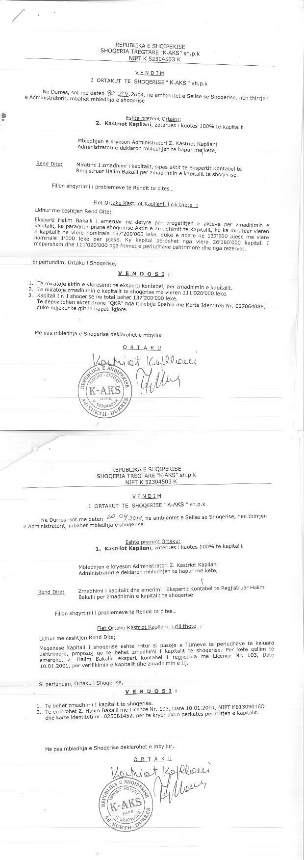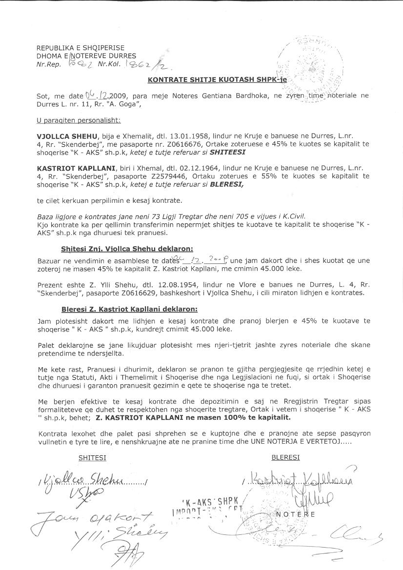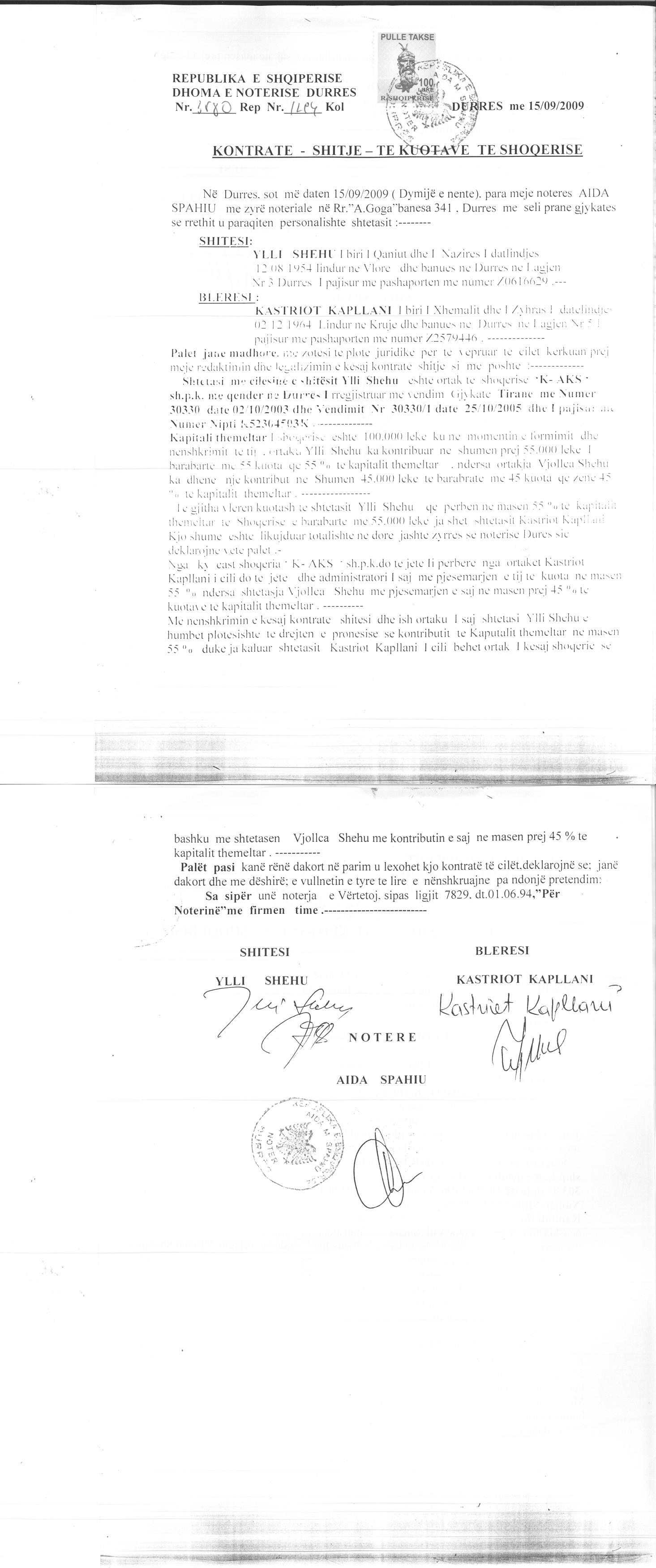 → Ekstrakt historik i regjistrit tregtar date 08.11.2021 → Akti i themelimit → Kontrate shitblerje kuotash date 19.10.2005 → Kontrate shitje kuotash date 04.12.2009 → Kontrate shitje te kuotave date 15.09.2009 → Vendim i ortakut te vetem per zmadhimin e kapitalit date 0.04.2014 |