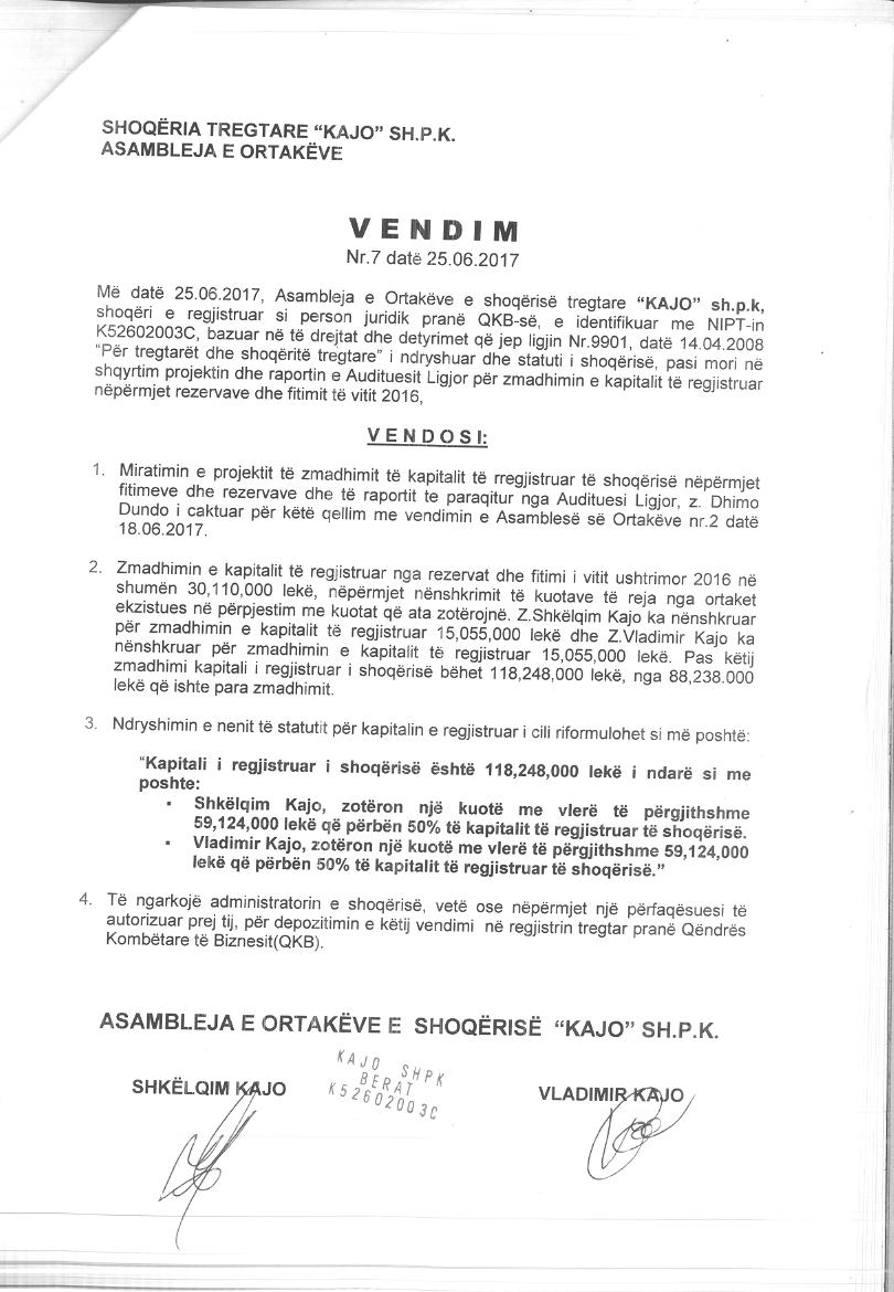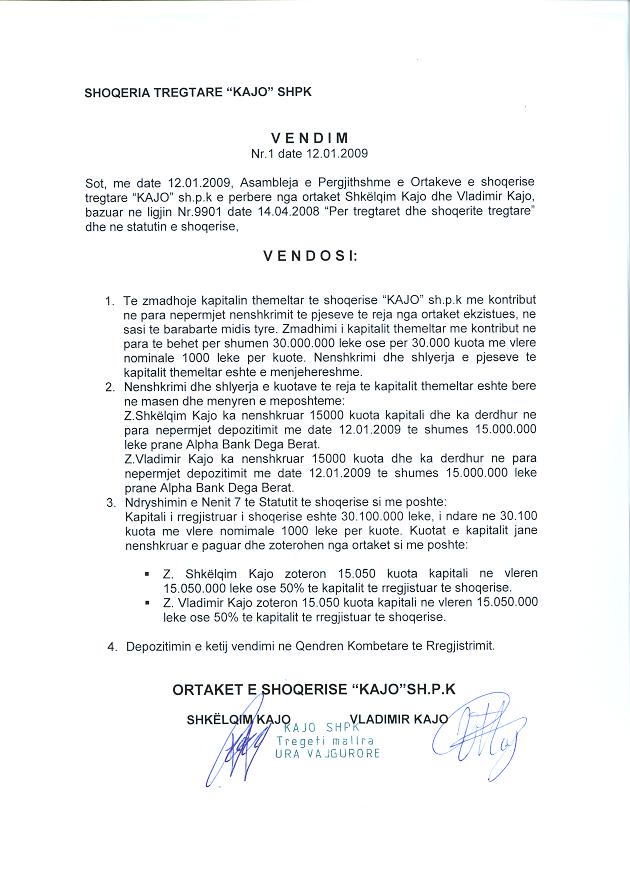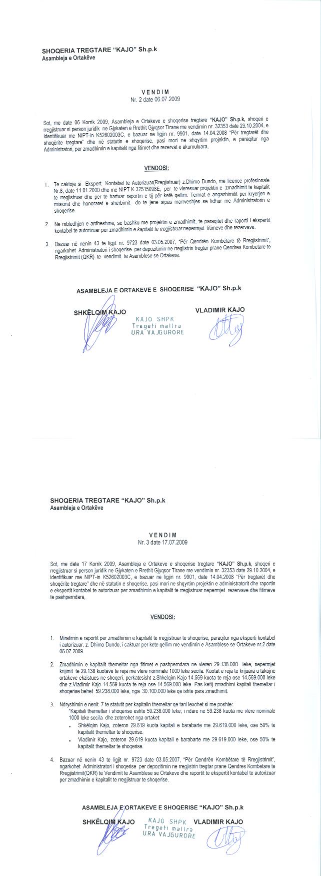 → Ekstrakt historik i regjistrit tregtar date 17.11.2021 → Kontrate themelimi → Vendimi i asamblese se ortakeve per zmadhimin e kapitalit date 06.07.2009 → Vendimi i asamblese se ortakeve per zmadhimin e kapitalit date 12.01.2009 → Vendimi i asamblese se ortakeve per miratimin e projektit te zmadhimit te kapitalit date 25.06.2017 |