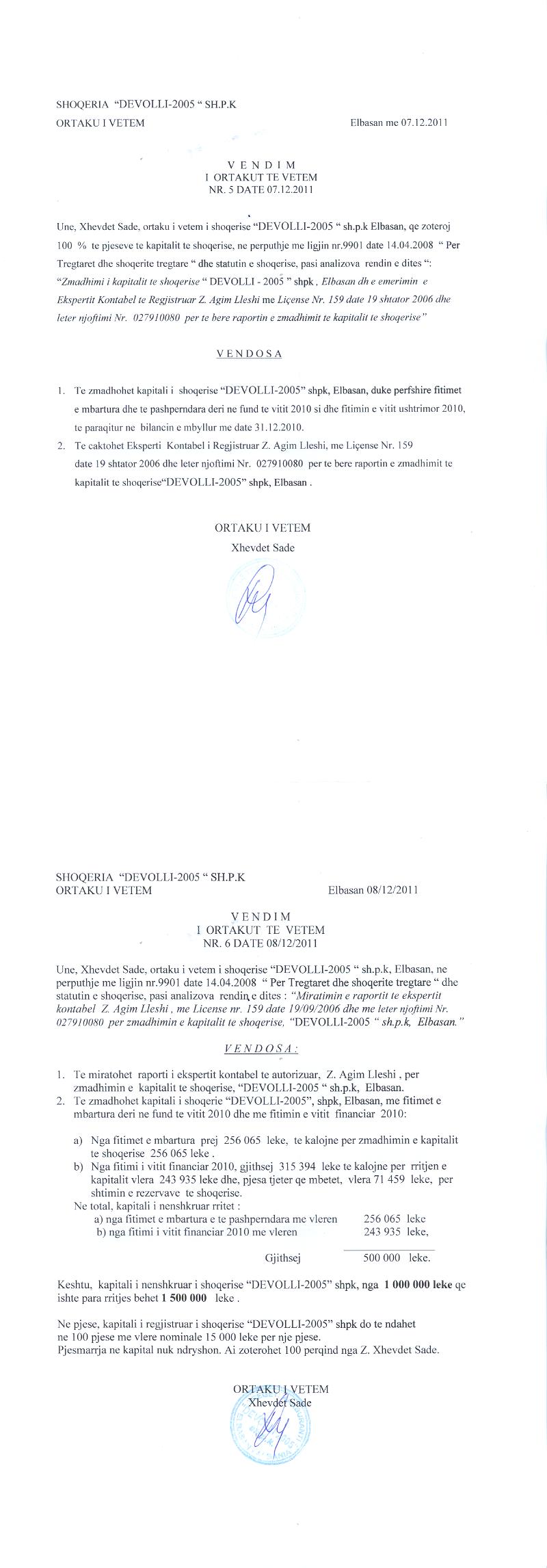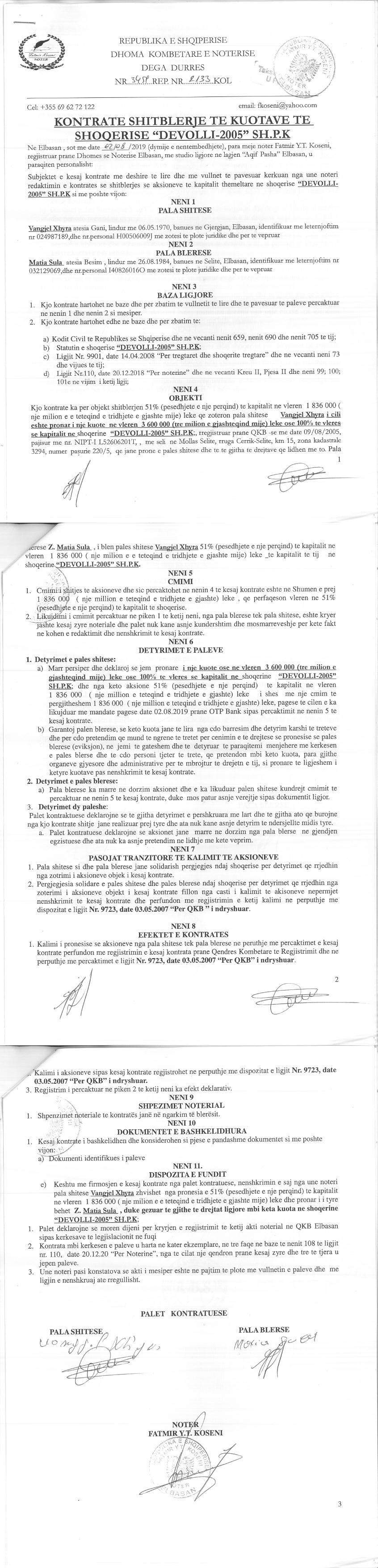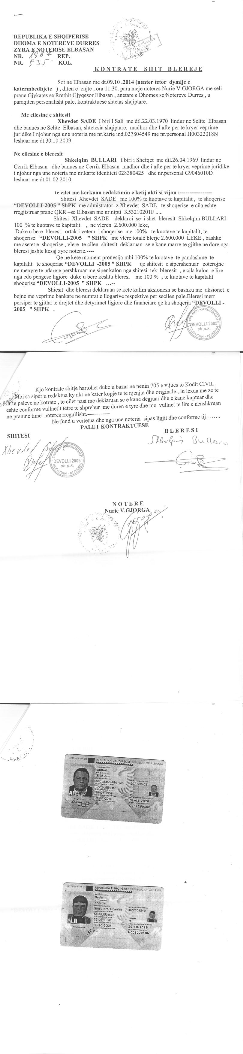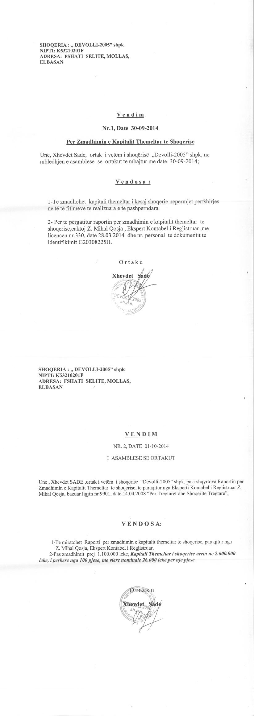 → Ekstrakt historik i regjistrit tregtar 10.11.2021 → Akti i themelimit dhe statuti → Kontrate shitblerje kuotash 09.10.2014 → Vendimi I ortakut te vetem per zmadhimin e kapitalit 07.12.2011 → Vendimi I asamblese per rritje kapitali 30.09.2014 → Kontrate shitblerje e kuotave date 01.03.2021 → Kontrate shitblerje e kuotave date 07.03.2019 → Kontrate shitblerje e kuotave date 02.08.2019 |