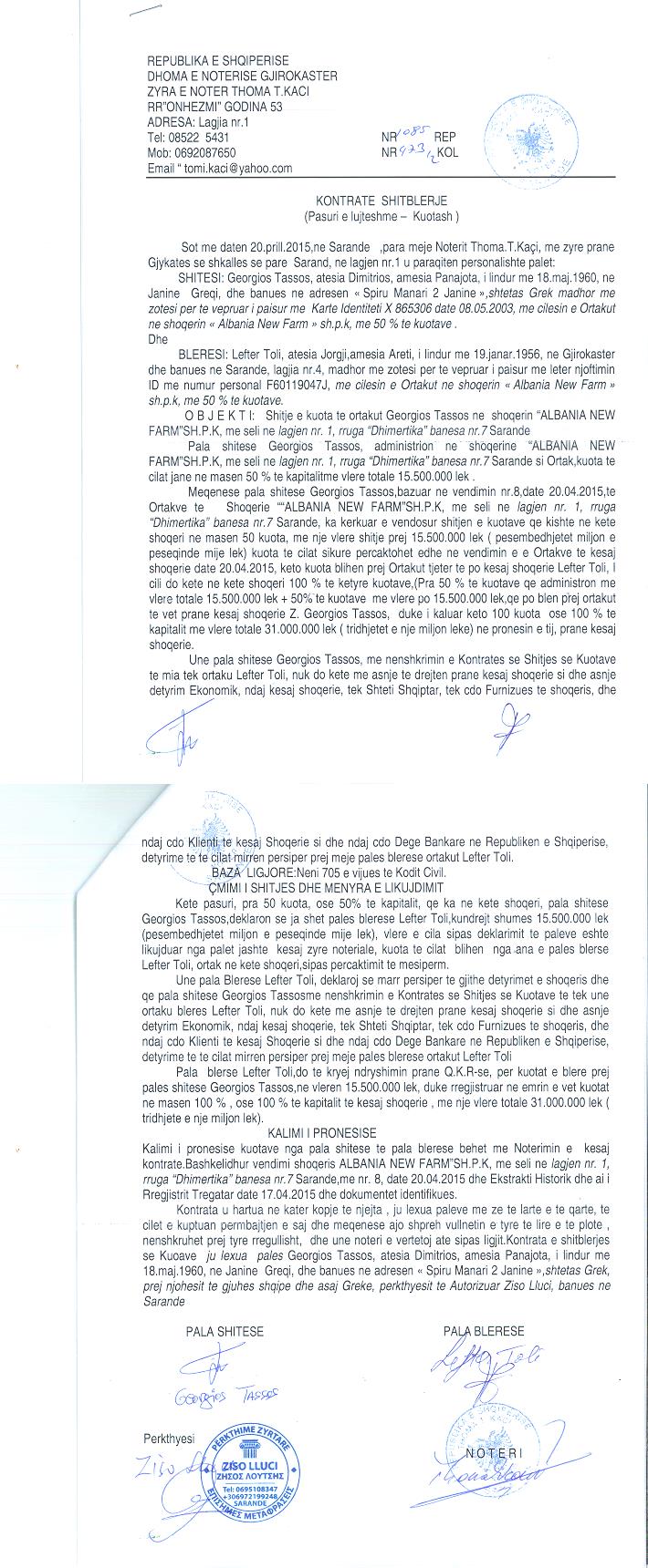→ Ekstrakt historik i regjistrit tregtar 11.02.2021 → Akti i themelimit dhe statuti → Vendim i asamblese se ortakeve per rritjen e kapitalit 26.08.2020 → Kontrate shit-blerje kuotash 20.04.2015 → Vendim i asamblese se ortakeve per zmadhimin e kapitalit 14.04.2015 |