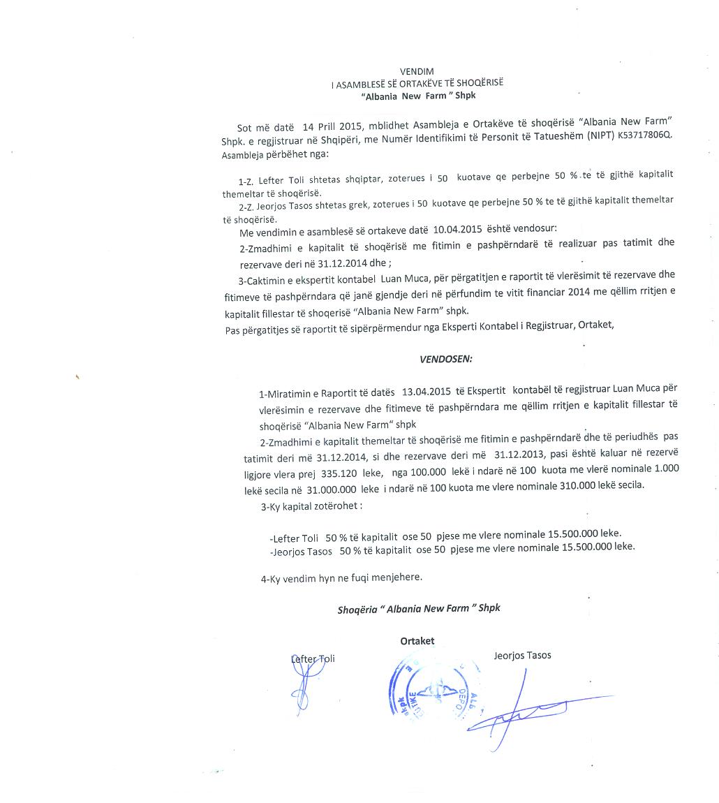 | Emërtime të tjera Tregtare: | ALBANIA NEW FARM SHPK |