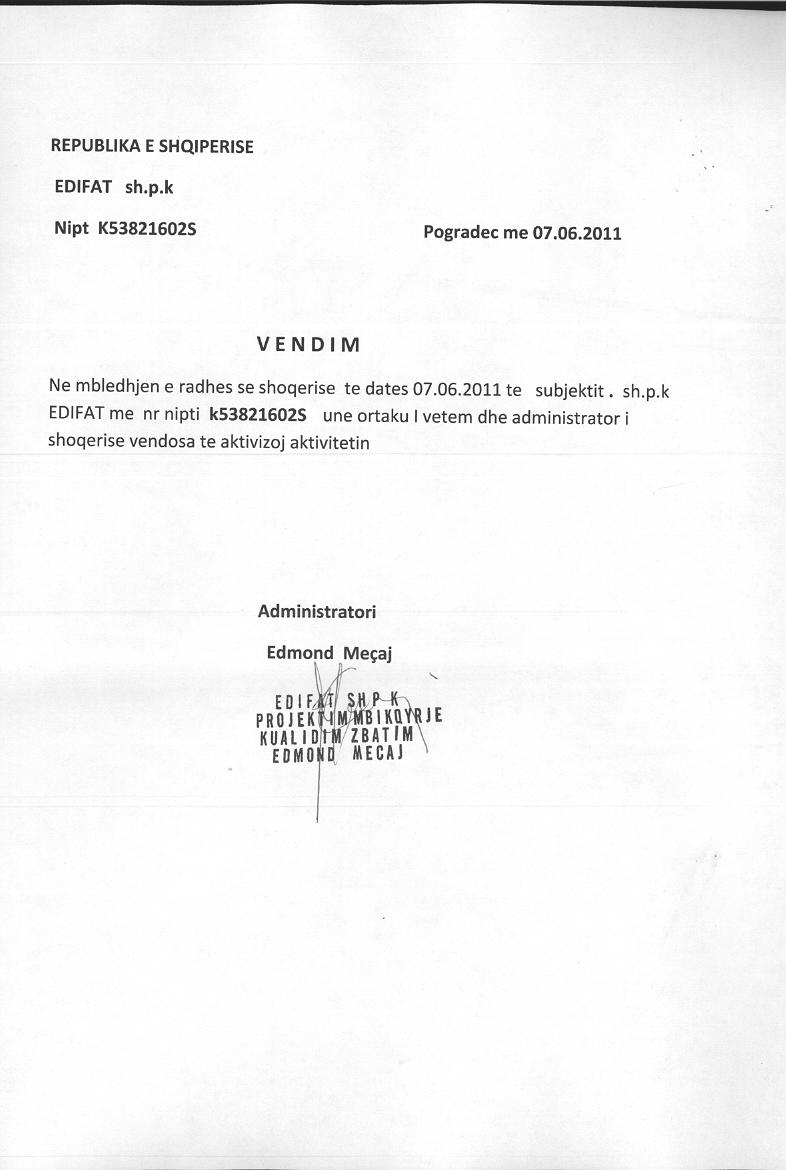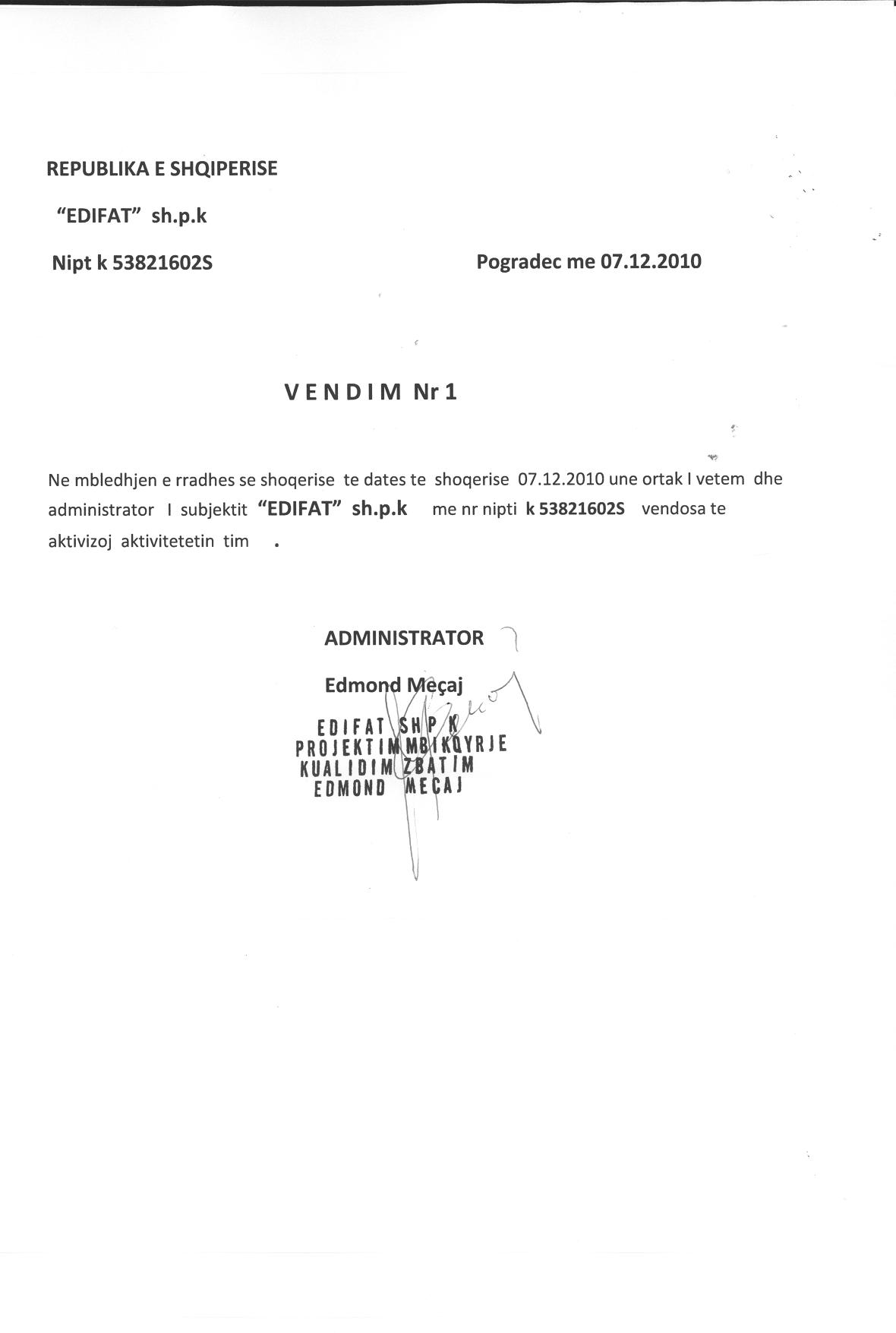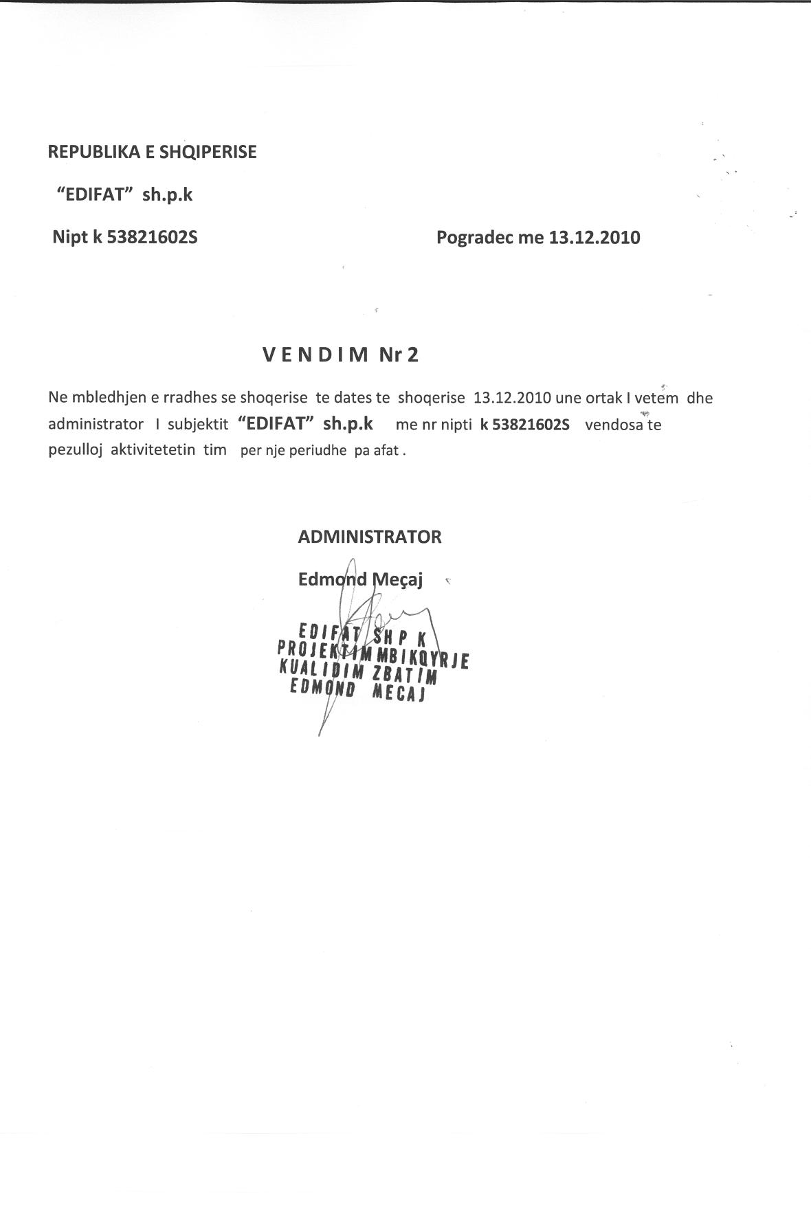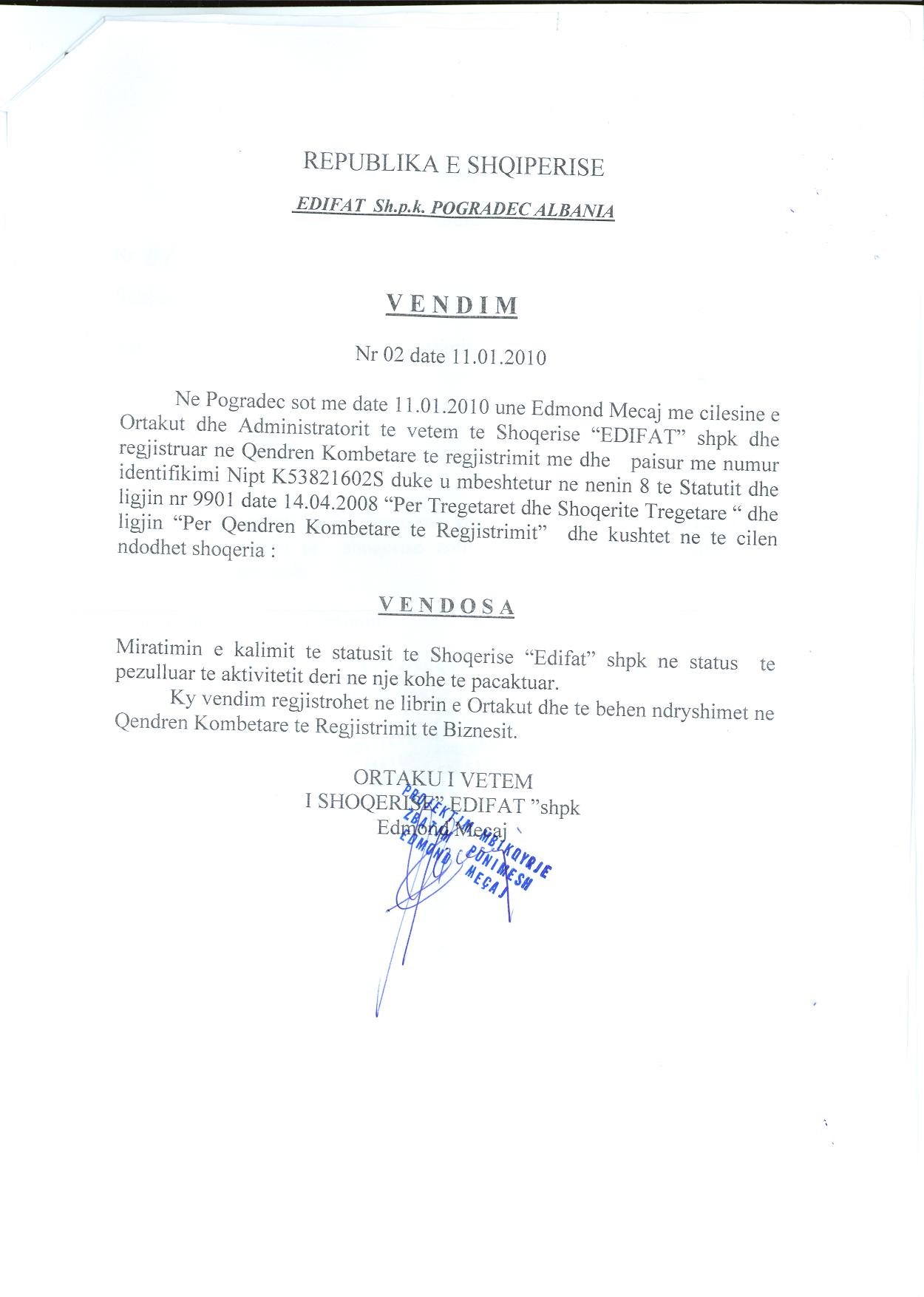 → Ekstrakt historik i regjistrit tregtar date 15.09.2021 → Akti i themelimit → Vendim i ortakut te vetem per aktivizimin e shoqerise date 07.12.2010 → Vendimi i ortakut te vetem per pezullimin e aktivitetit date 13.12.2010 → Vendim i ortakut te vetem per aktivizimin e shoqerise date 07.06.2011 → Vendimi i ortakut te vetem per pezullimin e aktivitetit date 11.01.2010 → Vendimi per pezullimin e aktivitetit date 28.03.2019 |