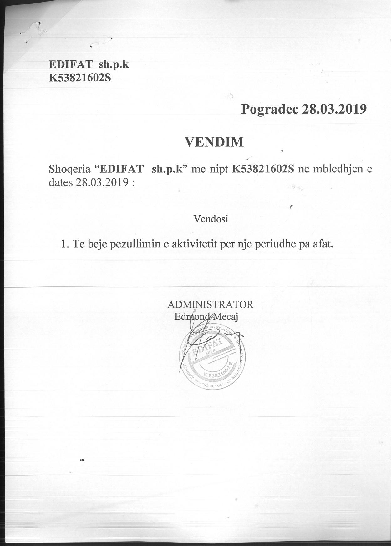 | Çështje Ligjore: | I. Me date 11.01.2010, me vendim te ortakut te vetem, u miratua kalimi i shoqerise ne status te pezulluar te aktivitetit deri ne nje kohe te pacaktuar. II. Me date 07.12.2010, me vendim te ortakut te vetem, u aktivizua veprimtaria e shoqerise. Statusi u kthye ne “Aktiv”. III. Me date 13.12.2010, me vendim te ortakut te vetem, u pezullua aktiviteti i shoqerise per nje periudhe pa afat. Statusi u kthye ne “Pezulluar”. IV. Me date 07.06.2011, me vendim te ortakut te vetem, u aktivizua veprimtaria e shoqerise. Statusi u kthye ne “Aktiv”. V. Me date 28.03.2019, aktiviteti i shoqerise u pezullua per nje periudhe te pacaktuar. Statusi i shoqerise behet “Pezulluar”. VI. Me date 12.04.2019, me vendim te ortakut te vetem, u aktivizua veprimtaria e shoqerise. Statusi u kthye ne “Aktiv”. |