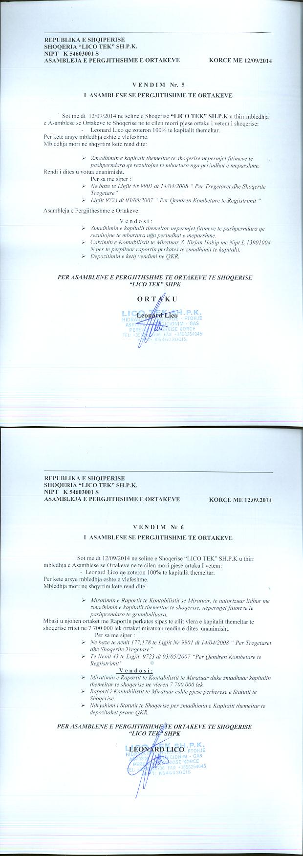 → Ekstrakti Historik i Regjistrit Tregtar date 07.03.2023 → Akt themelimi dhe Statuti i Shoqerise → Vendim i Ortakut te Vetem, Zmadhim Kapitali date 12.09.2014 |