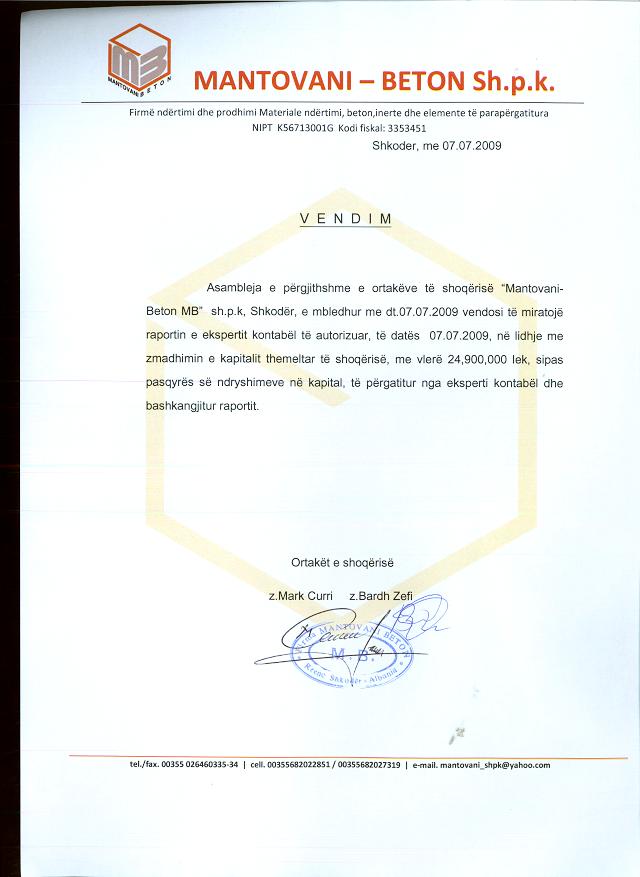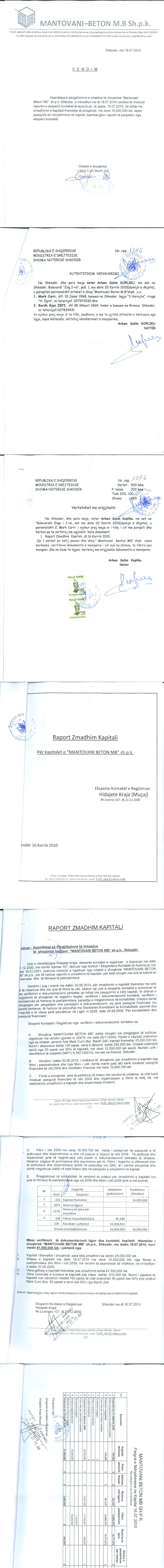 → Ekstrakt historik i regjistrit tregtar date 06.12.2021 → Akti i themelimit dhe statuti → Vendim i asamblese se ortakeve per zmadhimin e kapitalit date 26.06.2018 → Raporti i zmadhimit te kapitalit date 16.07.2010 → Vendimi i asamblese se ortakeve per zmadhimin e kapitalit date 07.07.2009 |