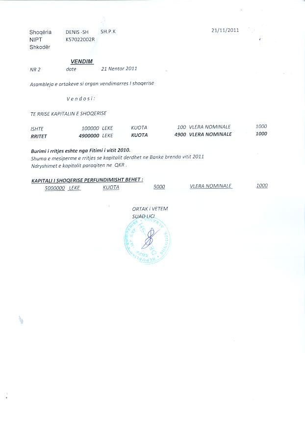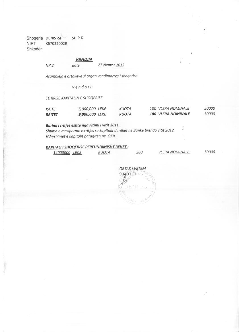 | Çështje Ligjore: | Sipas Vendimit te Asamblese se Pergjithshme date 01.11.2017, eshte ndryshuar statusi i shoqerise nga aktiv ne te pezulluar. |