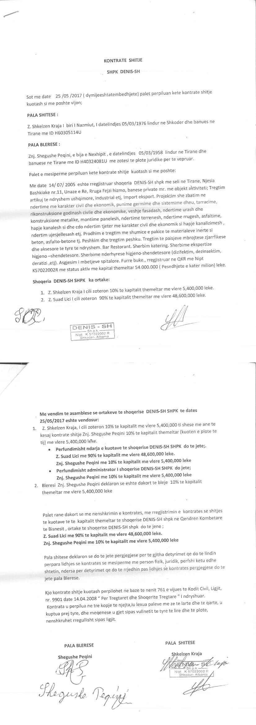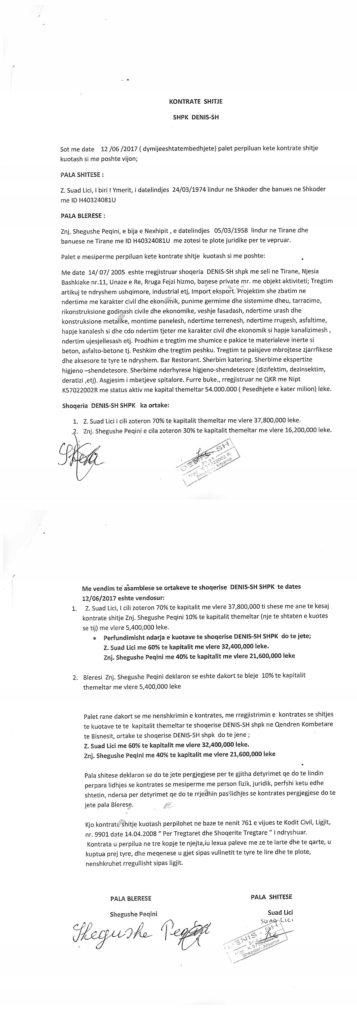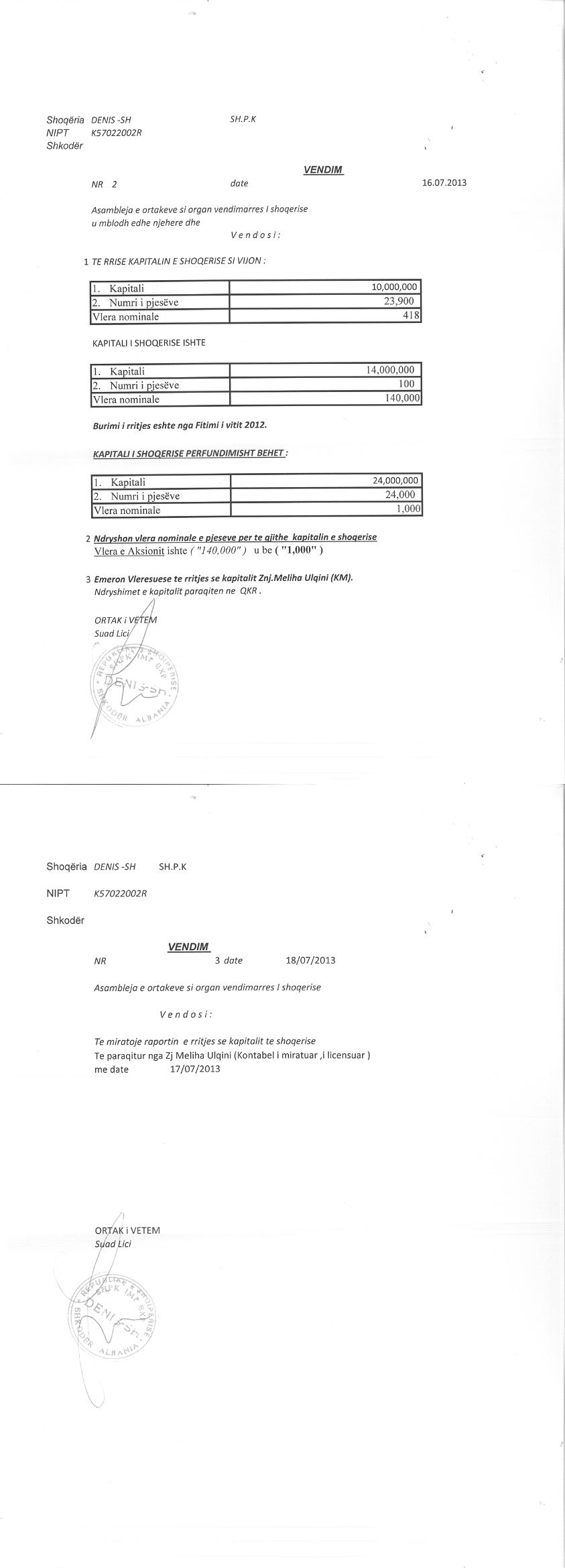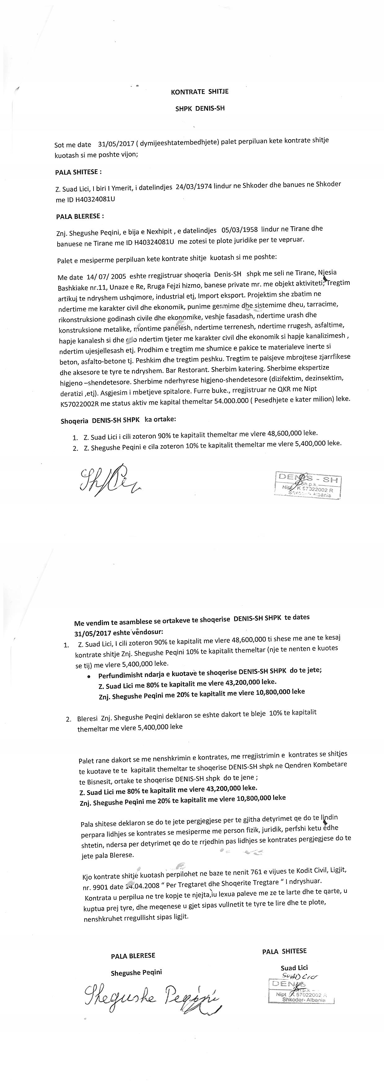 → Ekstrakti Historik i Regjistrit Tregtar date 21.12.2021 → Statusi fillestar i shoqerise → Statuti i Shoqerise → Kontrate e Shitjes se Kuotave date 21.07.2008 → Kontrate e Shitjes se Kuotave date 18.08.2011 → Vendim i Asamblese se Pergjithshme per rritjen e kapitalit date 27.11.2012 → Vendim i Asamblese se Pergjithshme per rritjen e kapitalit date 16.07.2013 → Vendim i Asamblese se Pergjithshme per rritjen e kapitalit date 10.09.2014 → Vendim i Asamblese se Pergjithshme per rritjen e kapitalit date 10.10.2015 → Kontrate e Shitjes se Kuotave date 18.04.2016 → Vendim i Asamblese se Pergjithshme per rritjen e kapitalit date 10.06.2016 → Kontrate e Shitjes se Kuotave date 25.05.2017 → Kontrate e Shitjes se Kuotave date 31.05.2017 → Kontrate e Shitjes se Kuotave date 07.06.2017 → Kontrate e Shitjes se Kuotave date 12.06.2017 → Kontrate e Shitjes se Kuotave date 20.06.2017 → Kontrate e Shitjes se Kuotave date 14.07.2017 → Kontrate e Shitjes se Kuotave date 22.07.2017 → Kontrate e Shitjes se Kuotave date 26.10.2017 → Kontrate e Shitjes se Kuotave date 05.07.2017 |