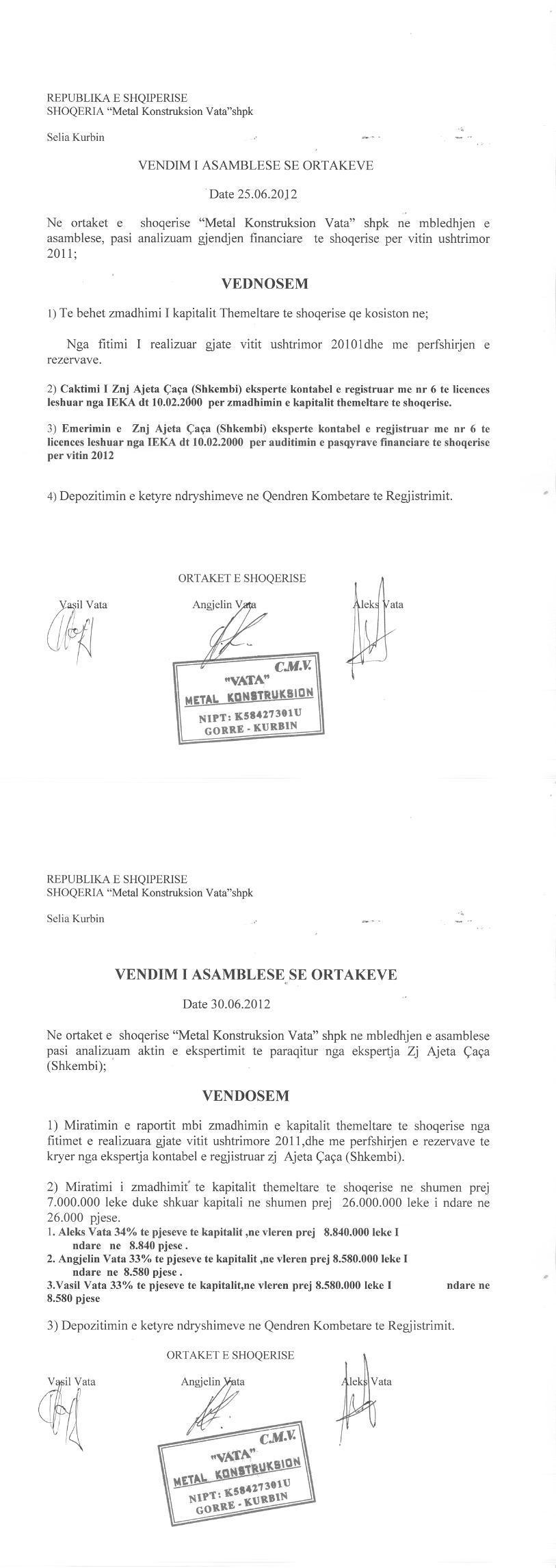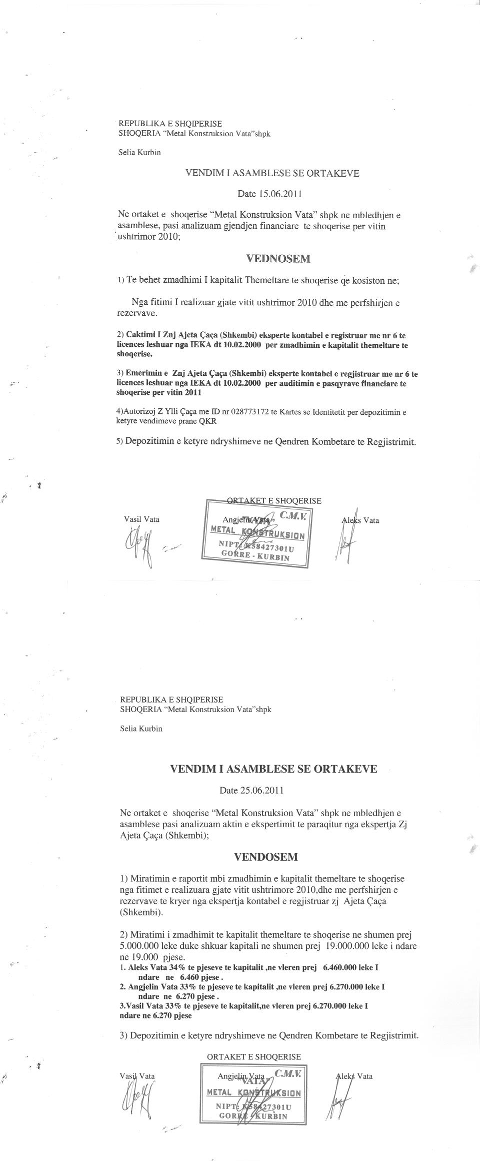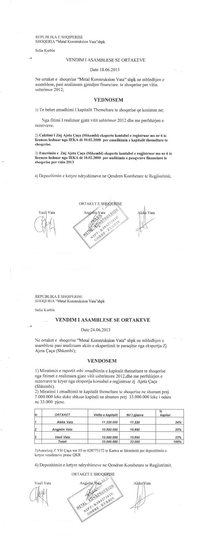 → Ekstrakt historik i regjistrit tregtar date 13.12.2021 → Akti i themelimit dhe statuti → Vendimi i asamblese se ortakeve per zmadhimin e kapitalit date 25.06.2012 → Vendimi i asamblese se ortakeve per zmadhimin e kapitalit date 18.06.2013 → Vendimi i asamblese se ortakeve per zmadhimin e kapitalit date 15.06.2011 → Vendimi i asamblese se ortakeve per zmadhimin e kapitalit date 22.12.2010 → Vendimi i asamblese se ortakeve per zmadhimin e kapitalit date 05.07.2019 |