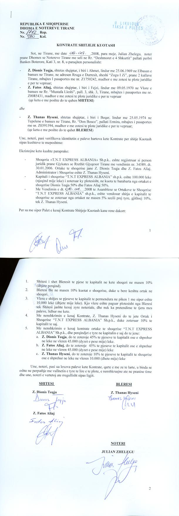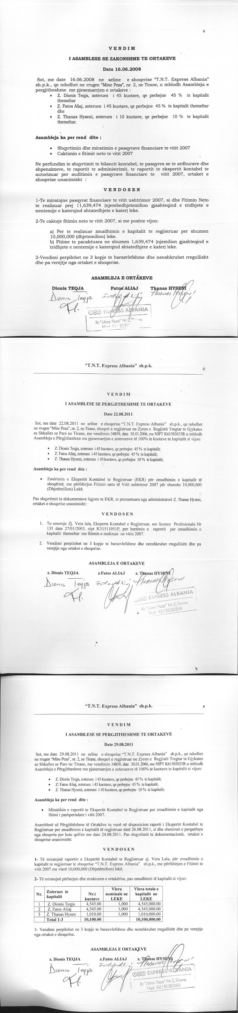 → Ekstrakti Historik i Regjistrit Tregtar date 14.03.2023 → Akt themelimi dhe Statuti i Shoqerise → Kontrate Shitje Kuotash date 08.04.2008 → Vendim i Asamblese se Ortakeve, Zmadhim Kapitali date 29.08.2011 → Marreveshje Shitblerje Kuotash date 12.05.2015 → Kontrate Dhurimi Kuotash date 17.05.2017 → Raport Marreveshja e Bashkimit te Shoqerive “RADMAIL” (shoqeria e perthithur) dhe “T.N.T EXPRESS ALBANIA” (shoqeria perthithese) date 01.10.2019 → Raport i Ekspertit Kontabel mbi Operacionin e Bashkimit me Perthithje date 02.10.2019 → Miratimi Projekt-Marreveshjes date 15.11.2019 |