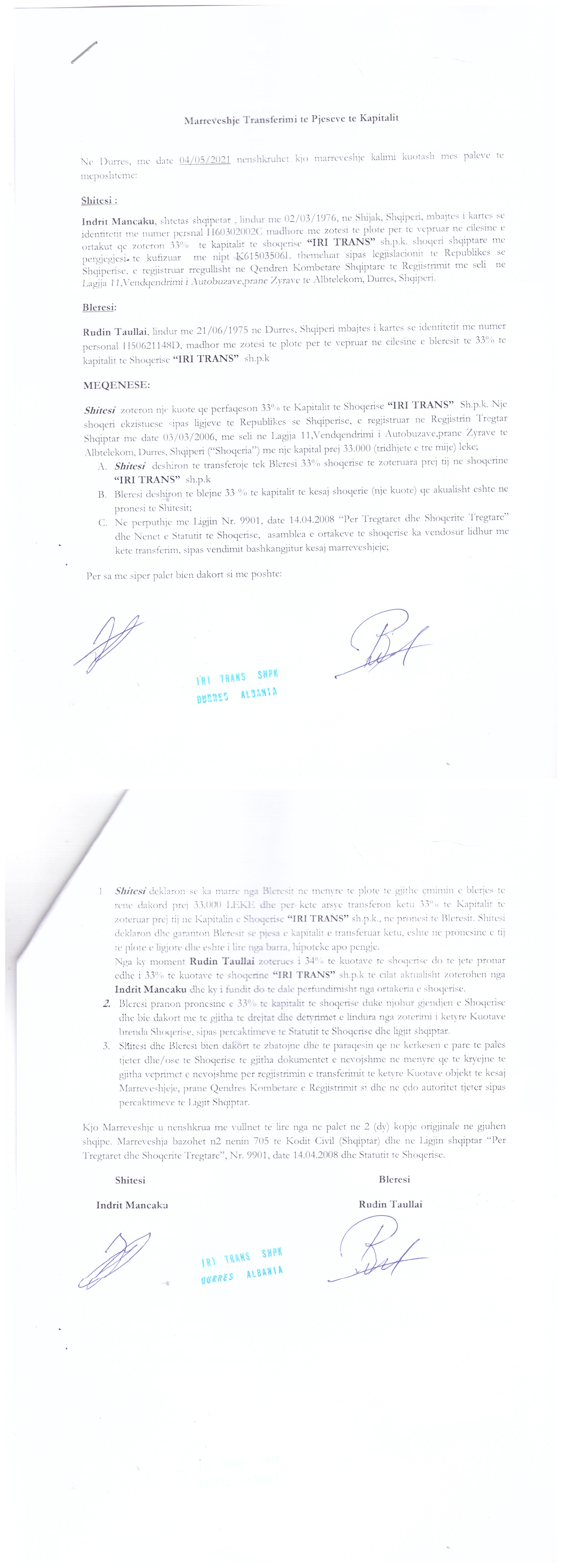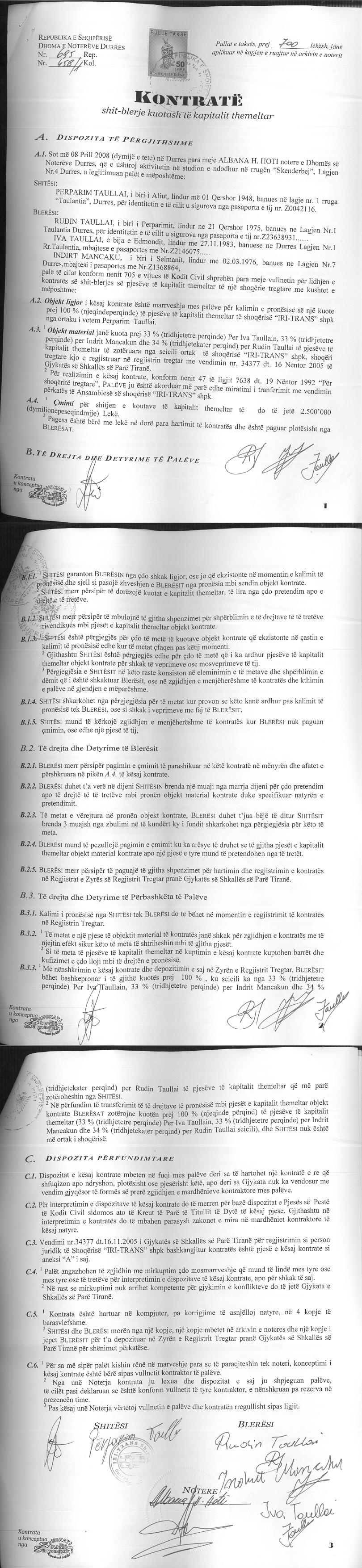 → Ekstrakti Historik i Regjistrit Tregtar date 21.02.2022 → Statuti i Shoqerise → Kontrate e Shit-blerjes se Kuotave date 08.04.2008 |