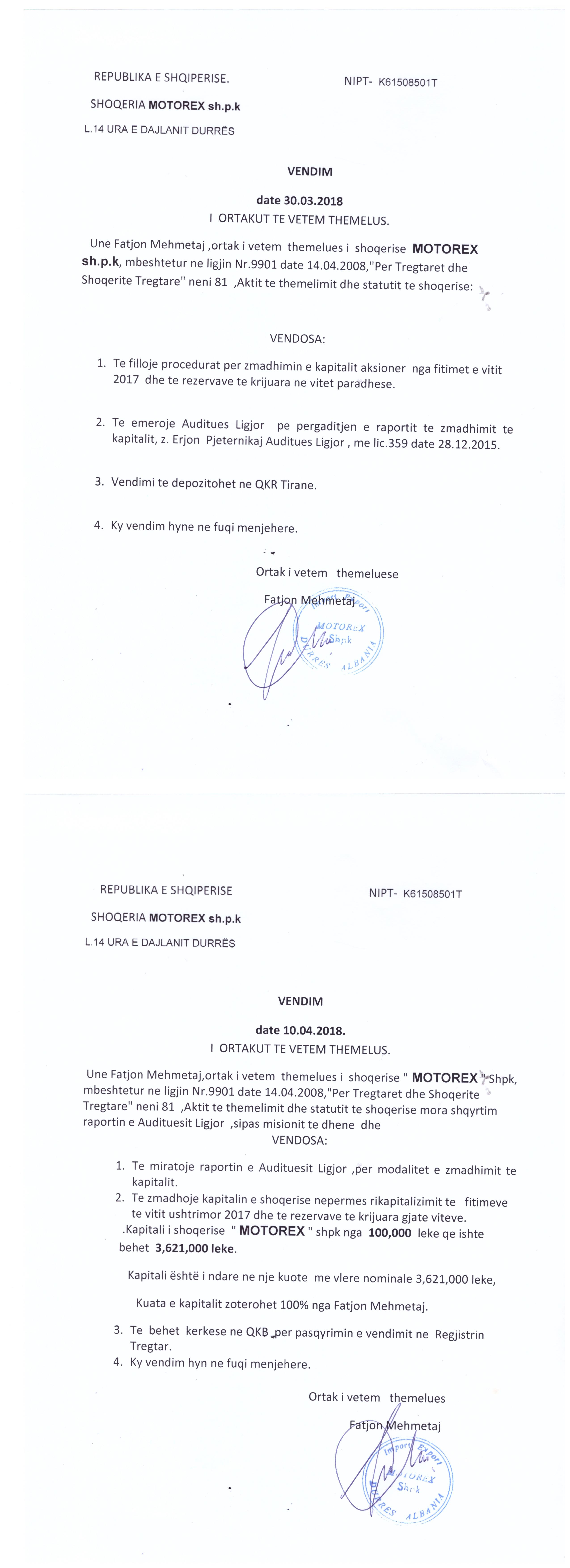 | Çështje Ligjore: | Shpallja per Shnderrimin e Shoqerise Me date 23/02/2015, me vendimit te ortakut te vetem date 01.02.2015, u vendos shnderrimi i shoqerise me pergjegjesi te kufizuar Motorex sh.p.k. ne shoqeri aksionare. |