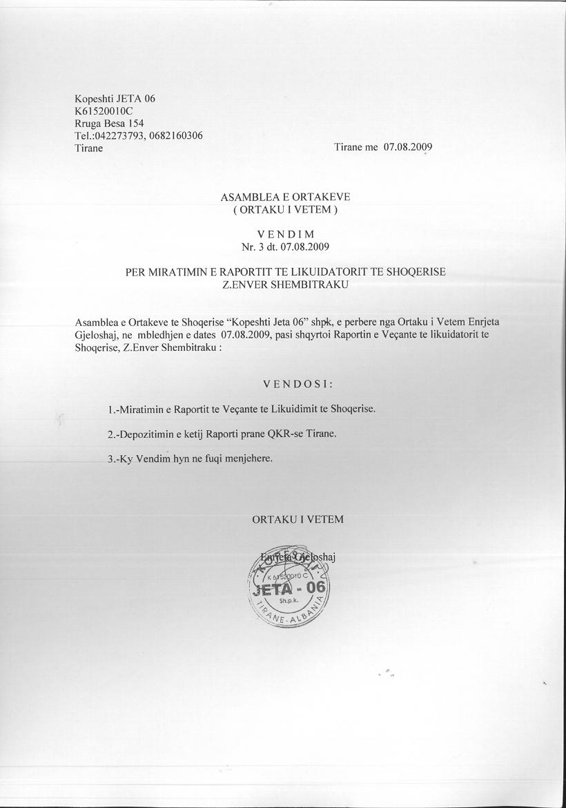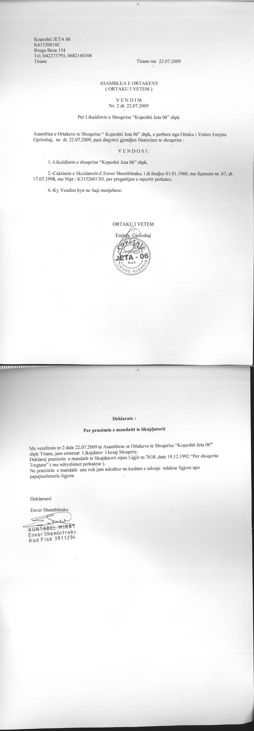 → Ekstrakti Historik i Regjistrit Tregtar date 08.07.2022 → Akt themelimi dhe Statuti i Shoqerise → Vendim i Ortakut te Vetem, Likuidimi i Shoqerise date 22.07.2009 → Vendim i Ortakut te Vetem, Likuidimi i Shoqerise date 07.08.2009 |