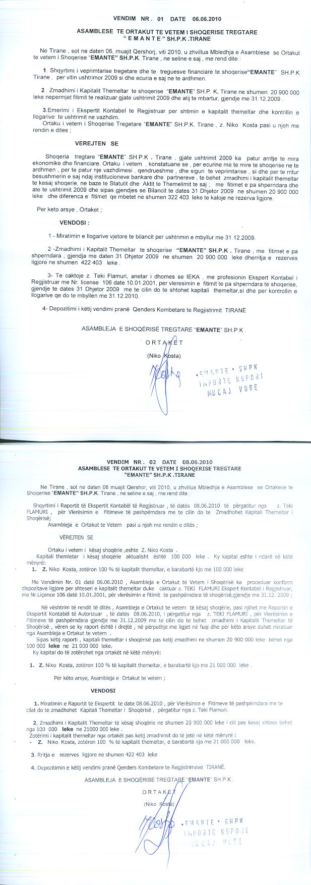 → Ekstrakt historik i regjistrit tregtar date 10.09.2021 → Akti i themelimit → Vendim i asamblese se ortakut te vetem per zmadhimin e kapitalit 15.09.2019 → Kontrate me transferim pjeserisht te aktivitetit/aseteve, date 24.10.2019 → Vendim i ortakut te vetem per zmadhimin e kapitalit date 06.06.2010 → Ekstrakt Historik i Regjistrit Tregtar date 07.11.2024 |