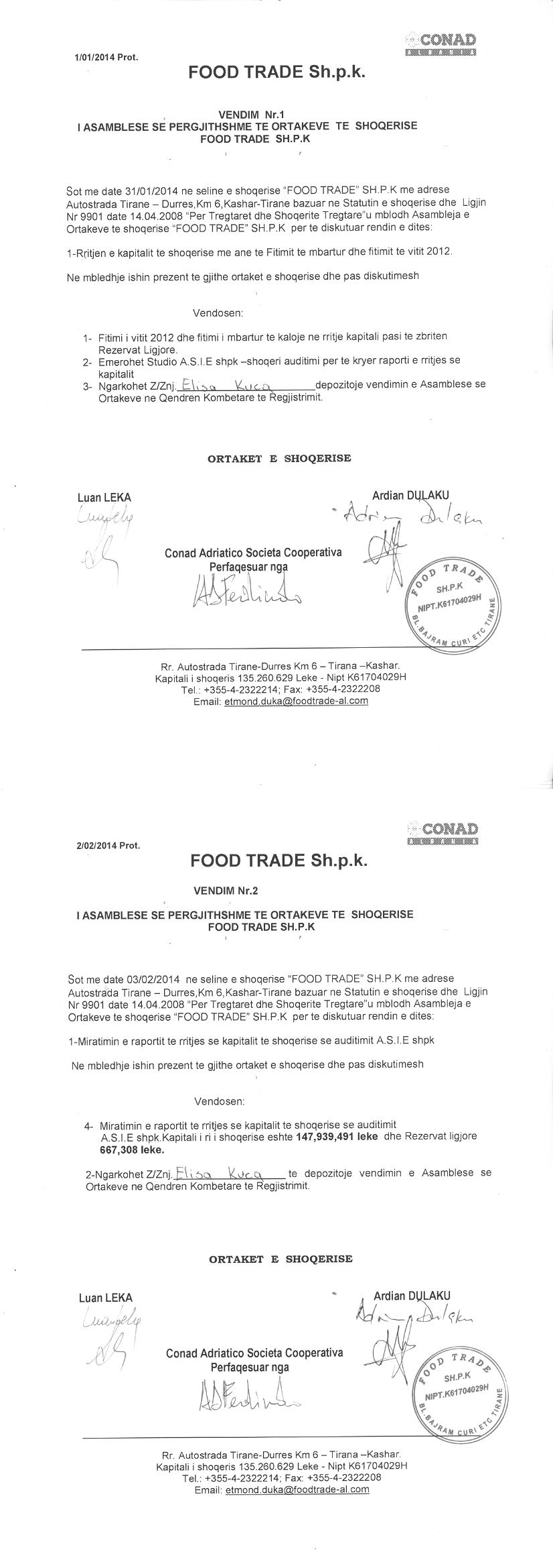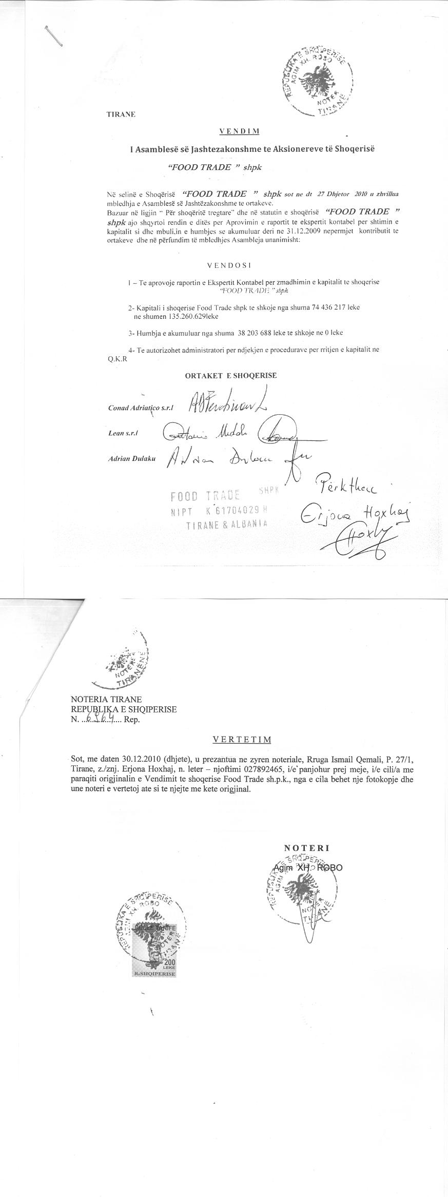 → Ekstrakti Historik i Regjistrit Tregtar date 05.11.2021 → Statuti i Shoqerise → Vendim i Asamblese se Pergjithshme per rritjen e kapitalit date 15.07.2009 → Vendim i Asamblese se Pergjithshme per rritjen e kapitalit date 27.12.2010 → Vendimi i Asamblese se Pergjithshme per ndryshim zoteruesi date 14.07.2011 → Vendim i Asamblese se Pergjithshme per rritjen e kapitalit date 31.01.2014 → Vendim i Asamblese se Pergjithshme per rritjen e kapitalit date 31.10.2014 → Vendim per Shitjen e Kuotave date 11.01.2015 → Kontrate e Shit-Blerjes se Kuotave date 21.12.2016 → Ekstrakt historik i regjistrit tregtar date 11.11.2023 → Ekstrakt historik i regjistrit te pronareve perfitues date 11.11.2023 |