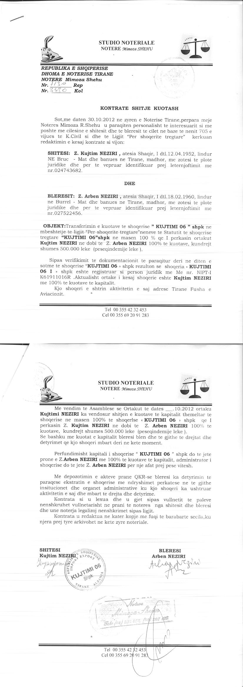 → Ekstrakti Historik i Regjistrit Tregtar date 20.09.2021 → Kontrate e Shitjes se Kuotave date 30.10.2012 |