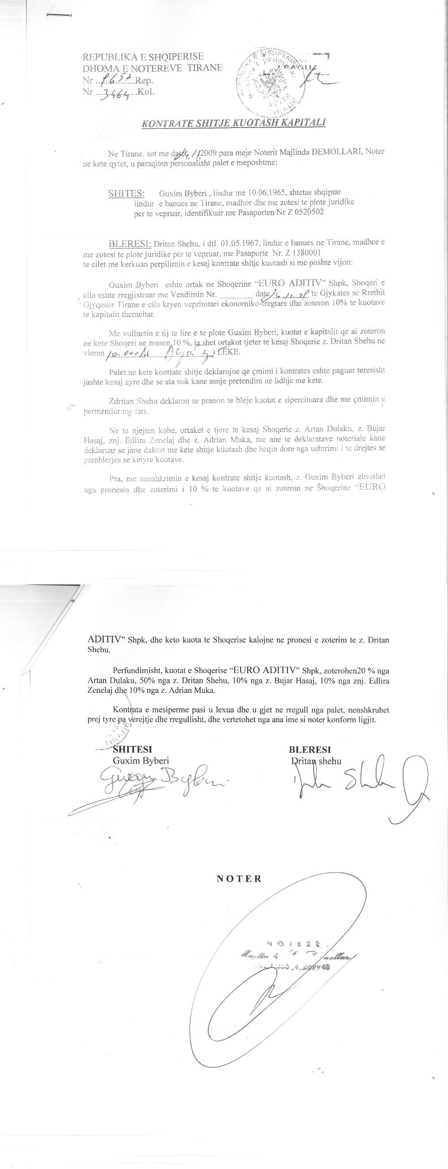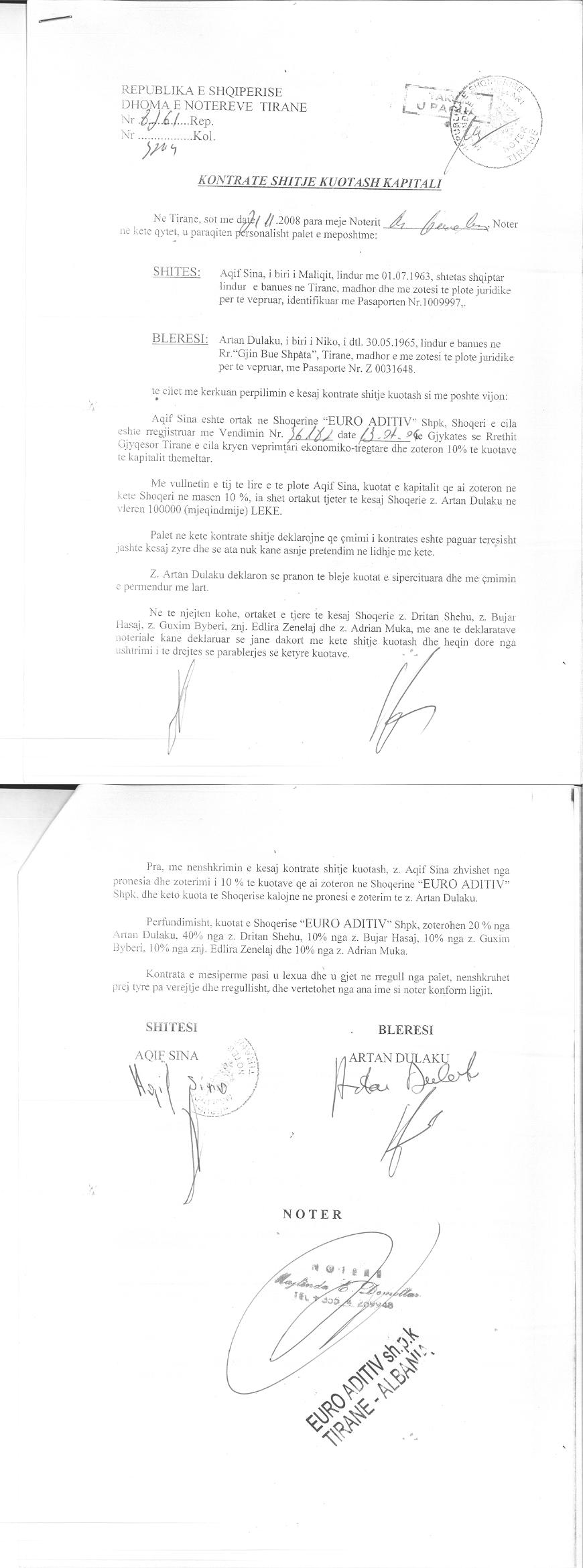keto kuota”. II. Me datë 21.05.2013, me anë të Urdhrit Nr.1358 Prot., lëshuar nga Shoqëria permbarimore "Bailiff Services Albania" sh.p.k., u urdhëruar: "Vendosja e masës së sekuestros konservative në kuota/aksione te cilat zoterohen nga pala debitore Bujar Hasaj ne shoqerite e regjistruara prane regjistrit tregtar. III. Me datë 14.08.2013, me anë të Urdherit Nr.8591 Prot., Nr.Dosje 218, lëshuar nga Shoqeria Permbaruese Private “E.P.S.A” sh.p.k, u urdhërua: -Heqja e mases se sekuestros mbi kuotat e debitorit Z.Bujar Kovaç Hasaj kerkuar nga ana jone me shkresen Nr.11651 Prot, date 28.08.2012. IV. Me datë 01.12.2015, me anë të urdhrit Nr. 1595/6 - 1195 - 15 Prot., leshuar nga shoqeria "Kodra Bailiff Service" sh.p.k, u urdhërua: vendosja e mases se sekuestros konservative mbi aktivin qe zoteron debitori Euro Aditiv sh.p.k, me NUIS (NIPT) K61921014F. Ky aktiv te qendroje i bllokuar der ne nje urdher te dyte. V. Me datë 25.04.2019, me anë të urdhrit Nr.713 - 1195 -15 Prot., leshuar nga shoqeria "Kodra Bailiff Service" sh.p.k, për heqjen e mases se sekuestros konservative mbi kuotat/aksionet e debitorit Euro Aditiv sh.p.k, me NUIS (NIPT) K61921014F, si dhe mbi te drejtat qe rrjedhin prej tyre. Heqjen e mases se sekuestros konservative ne te tjera kuota/aksione te debitorit ne shoqeri te tjera te regjistruara prane regjistrit tregtar. VI. Me datë 07.06.2019, me anë të Urdhrit Nr. 112 Prot., Nr. 222 Regj., leshuar nga Shoqeria Permbarimore “Avdulaj Bailiff Services” sh.p.k, u urdherua: Heqja e mases se sekuestros konservative mbi aktivet e shoqerise “EURO ADITIV” sh.p.k, me NUIS (NIPT) K61921014F, te bllokuara me ane te shkreses Nr. 1358 Prot., date 21.05.2013 te shoqerise permbarimore Bailiff Services Albania. VII. Me datë 08.06.2023, me anë të shkresës Nr. 26371 Prot, për Vendosje të Masës së Sigurimit të Detyrimit Tatimor, lëshuar nga Drejtoria e Përgjithshme e Tatimeve, Rajoni Qendror, u kërkua: Vendosje të masës së sigurimit të detyrimit tatimor, mbi tatimpaguesin shoqëria " EURO ADITIV " SHPK, pajisur me NUIS (Nipt)- K61921014F, me perfaqësues ligjor Dritan Shehu. Vendosja e kësaj masë synon të moslejohet tjetërsimi i titujve të pronësisë dhe të drejtat pasurore që i përkasin këtij tatimpaguesit deri në shlyerjen e detyrimeve tatimore. |