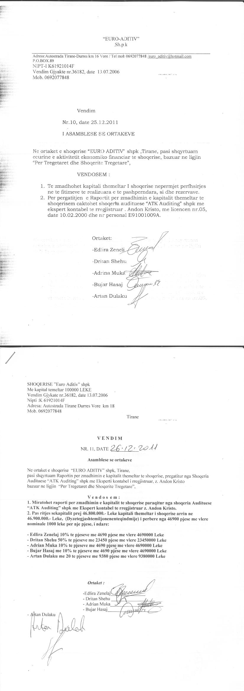 → Ekstrakt Historik i Regjistrit Tregtar date 25.07.2024 → Akt themelimi dhe Statuti i Shoqerise → Kontratë Shitje Kuotash Kapitali datë 21.11.2008 → Kontratë Shitje Kuotash Kapitali datë 24.11.2009 → Vendim i Asamblesë së Ortakëve, Zmadhim Kapitali datë 26.12.2011 → Urdhër për Vënien e Sekuestros datë 28.08.2012 → Urdhër për Vënien e Sekuestros datë 21.05.2013 → Urdhër për Heqjen e Sekuestros datë 14.08.2013 → Urdhër për Vënien e Sekuestros datë 01.12.2015 → Urdhër për Heqjen e Sekuestros datë 25.04.2019 → Vendim i Asamblesë së Ortakëve, Zvogëlim Kapitali datë 29.05.2019 → Urdhër për Heqjen e Sekuestros datë 07.06.2019 → Kontratë Shitje Kuotash Kapitali datë 16.10.2019 → Kontratë Shitje Kuotash Kapitali datë 04.08.2022 → Kërkesë për Vendosje të Masës së Sigurimit të Detyrimit Tatimor datë 08.06.2023 → Kontratë Shitje Kuotash Kapitali datë 01.12.2022 |
