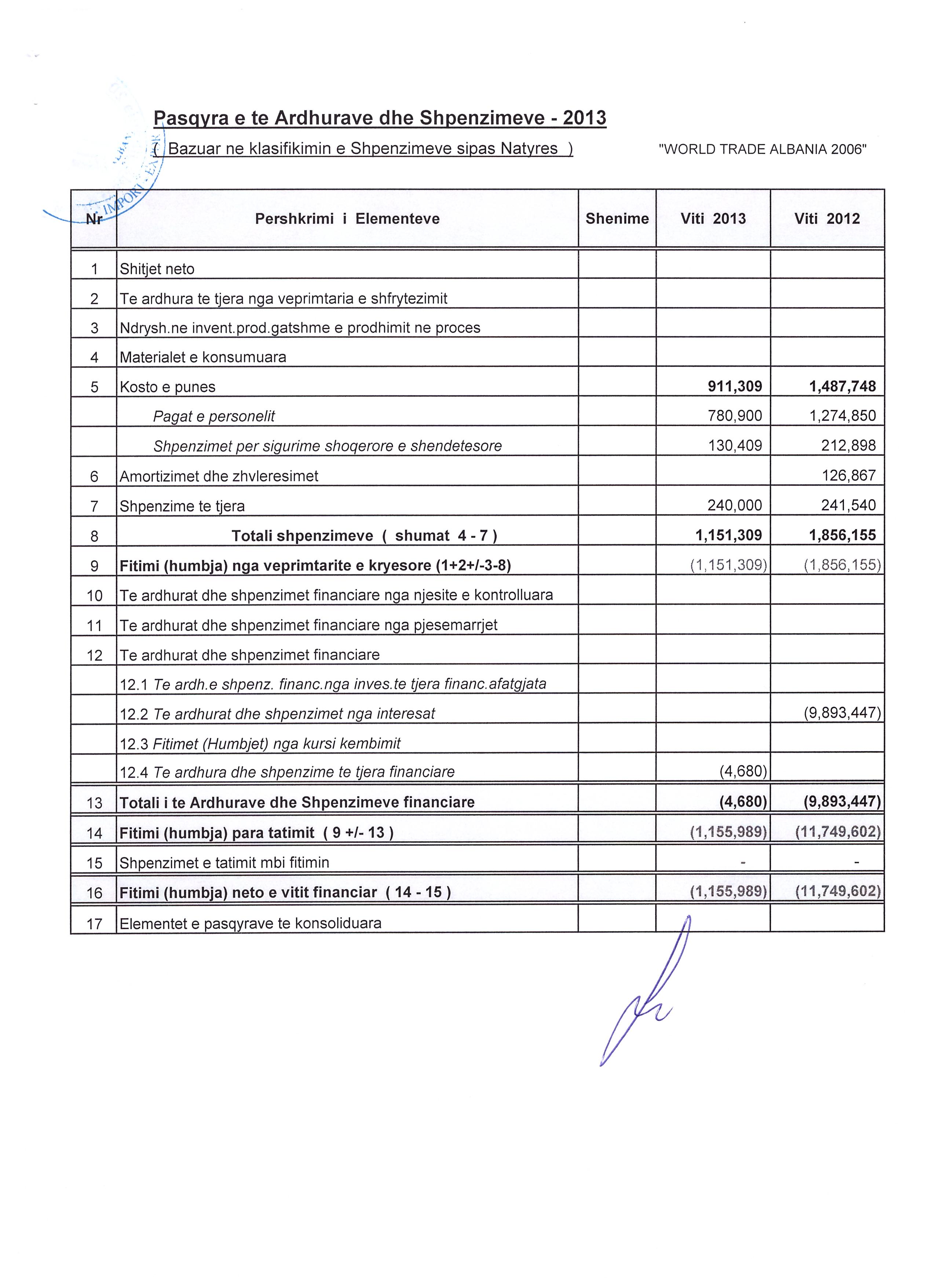 -1 155 989,00 Fitimi para Tatimit(Lekë) 2012: -11 749 602,00 Fitimi para Tatimit(Lekë) 2011: -16 286 704,00 Fitimi para Tatimit(Lekë) 2010: -13 629 660,00 Fitimi para Tatimit(Lekë) 2009: -5 239 923,00 |