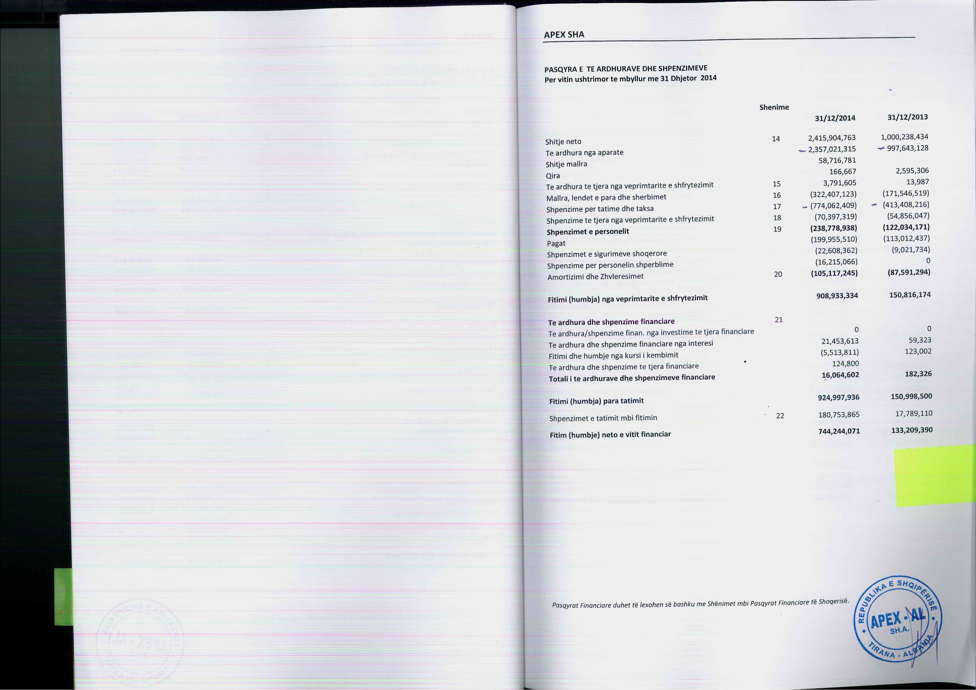Xhiro Vjetore(Lekë) 2022:3 241 810 505,00 Xhiro Vjetore(Lekë) 2021:3 368 871 887,00 Xhiro Vjetore(Lekë) 2020:1 060 332 978,00 Xhiro Vjetore(Lekë) 2019:4 658 599,00 Xhiro Vjetore(Lekë) 2018:2 327 335 615,00 Xhiro Vjetore(Lekë) 2017:2 482 096 142,00 Xhiro Vjetore(Lekë) 2016:2 478 574 219,00 Xhiro Vjetore(Lekë) 2015:2 332 429 931,00 Xhiro Vjetore(Lekë) 2014: 2 415 904 763,00 Xhiro Vjetore(Lekë) 2013: 1 000 238 434,00 Xhiro Vjetore(Lekë) 2012: 1 113 048 654,00 Xhiro Vjetore(Lekë) 2011: 1 083 817 272,00 Xhiro Vjetore(Lekë) 2010: 1 089 360 093,00 Xhiro Vjetore(Lekë) 2009: 794 161 600,00 |