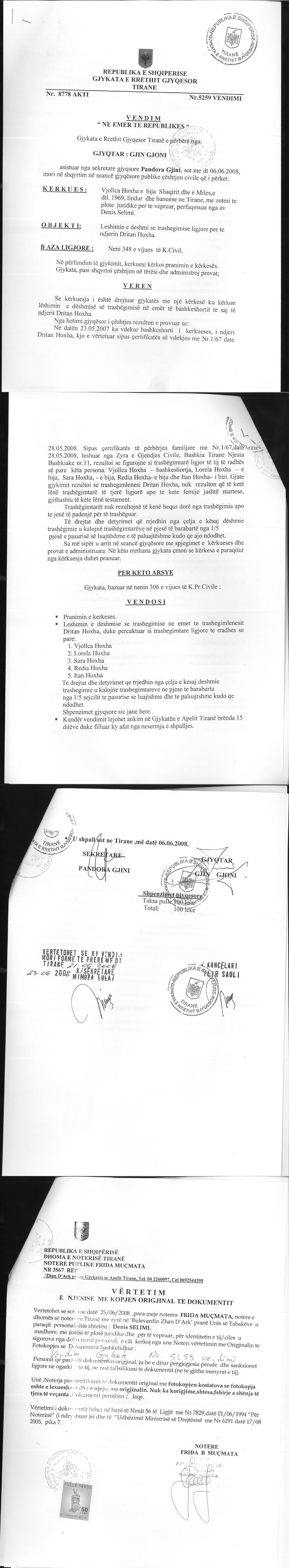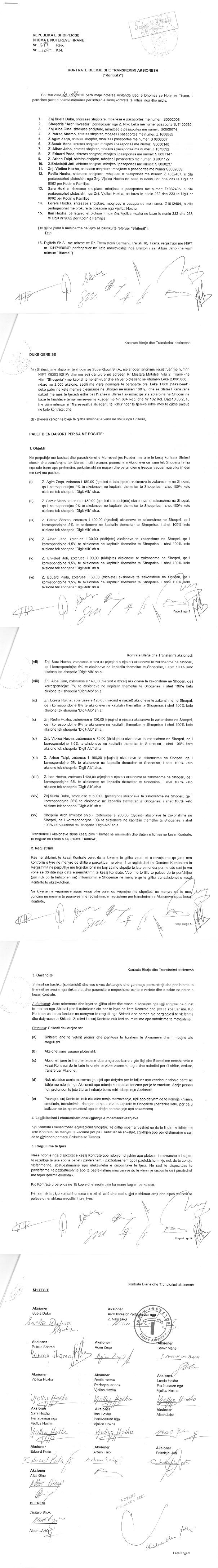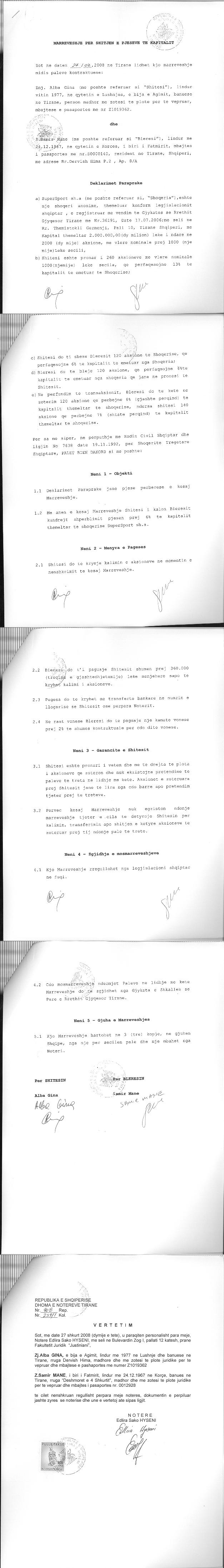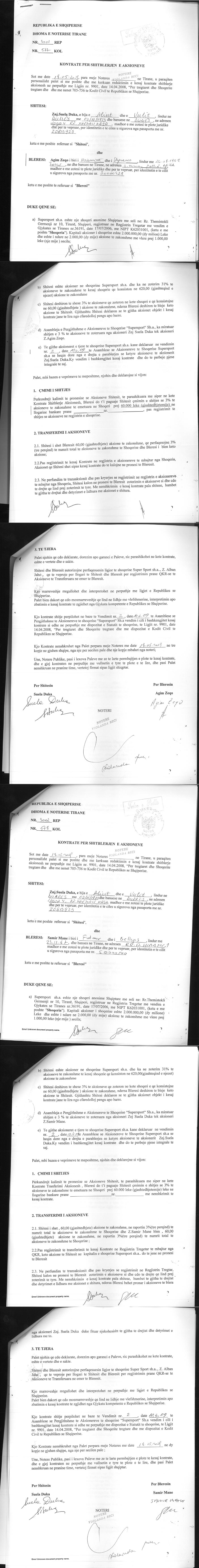 → Ekstrakt historik i regjistrit tregtar date 29.10.2022 → Akti i themelimit dhe statuti → Marreveshje per shitjen e pjeseve te kapitalit date 27.02.2008 → Vendim i Gjykates se Rrethit Gjyqesor Tirane date 06.06.2008 per leshimin e deshmise e trashegimise → Kontratat per shitblerjen e aksioneve date 04.03.2009 → Kontrate per shitblerjen e aksioneve date 18.05.2009 → Kontrate blerje dhe transferimi aksionesh date 10.03.2010 → Shkrese per pezullimin e veprimtarise 14.05.2012 → Kerkese per kalimin ne status aktiv date 23.04.2015 → Vendimet e asamblese dhe marreveshja e bashkimit me perthithje date 23.11.2015 |