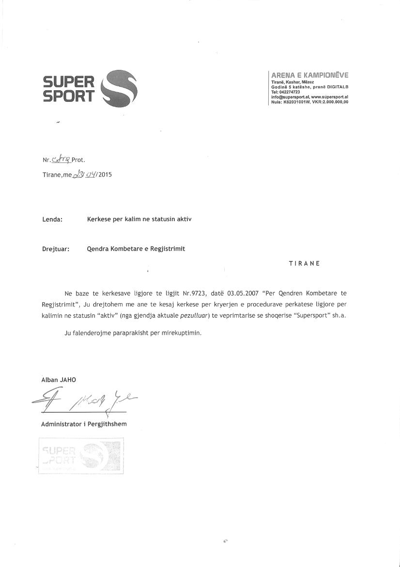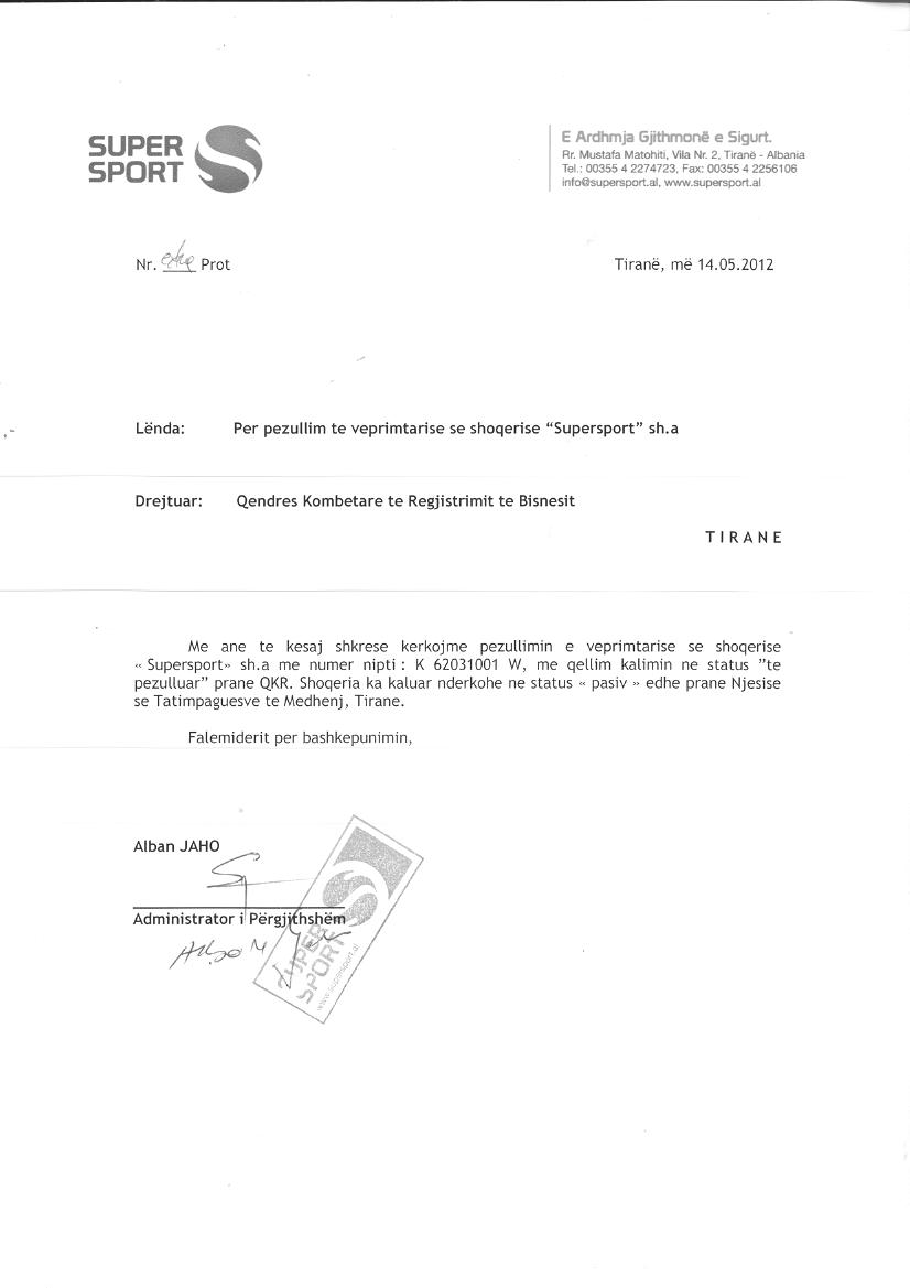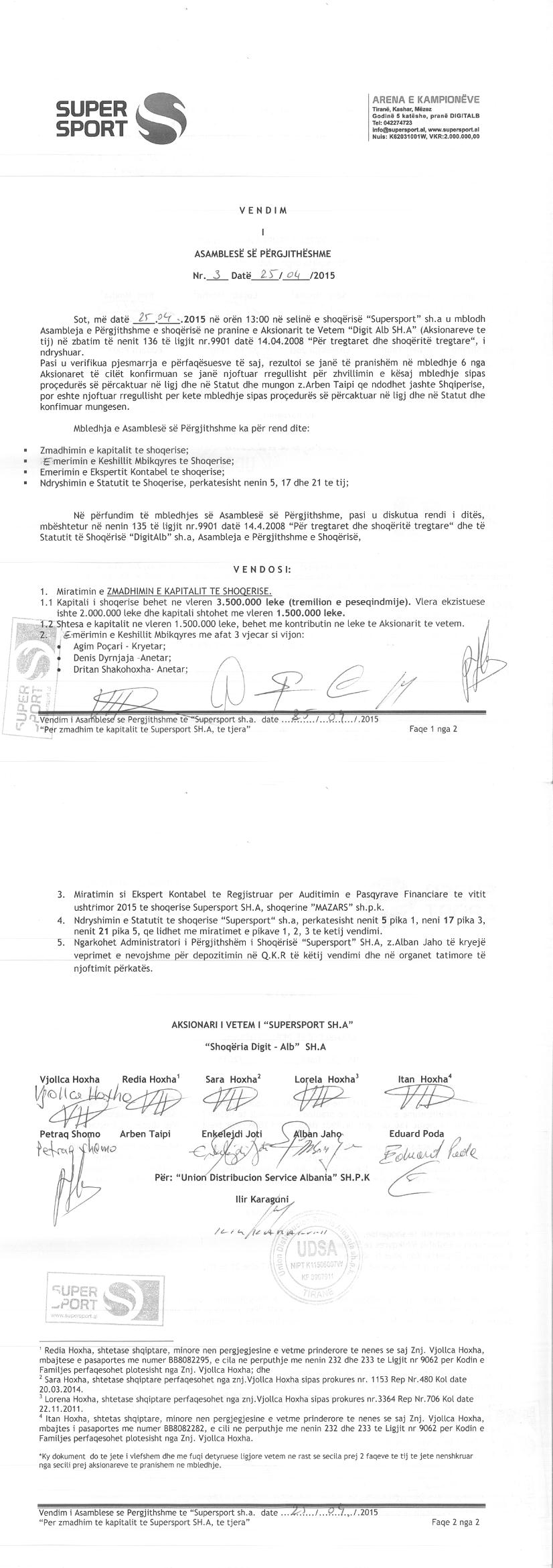 | Çështje Ligjore: | Me date 14.05.2012, u pezullua veprimtaria e shoqerise. Statusi ndryshon nga “Aktiv” ne “Pezulluar”. Me date 23.04.2015, me kerkese te administratorit, shoqeria u kalua ne statusin “Aktiv”. BASHKIMI ME PERTHITHJE: Ne date 21.12.2015: Ne baze te Vendimit te Asamblese 05 date 18.11.2015 dhe Projekt Marreveshjes se Bashkimit me Perthithje date 23.11.2015, eshte miratuar fillimi i procedurave per Bashkimin me Perthithje te shoqerise Supersport Sh.a (shoqeria e perthithur) nga Digitalb Sh.a (shoqeria perthithese). Ne baze te Vendimit te Asamblese Nr.02 date 18.01.2016 dhe Marreveshjes se Bashkimit me Perthithje date 18.01.2016 eshte miratuar bashkimi me perthithje me date mbyllje 31.12.2015, te shoqerise Supersport Sh.a nga shoqeria Digitalb Sh.a. Ne daten 23.11.2015, u nenshkrua marreveshja e bashkimit me perthithje ndermjet shoqerise Supersport Sh.a (shoqeria e perthithur) nga Digitalb Sh.a (shoqeria perthithese). Supersport sha transferon tek shoqeria Digit-alb sh.a teresine e elementeve te aktivit dhe pasivit. Si rezultat i operacionit te bashkimit, kapitali aksionar i shoqerise Digitalb mbetet i njejte. Kapitali aksionar i shoqerise Supersport sh.a netohet ne bilancin e konsoliduar te te dy shoqerive me vleren e pjesemarrjes dhe diferenca mes tyre kalon si emer i mire. Duke qene se Supersport sha zoterohet 100% nga Digit-Alb sha nuk ka raporte te kembimit te kapitalit. |