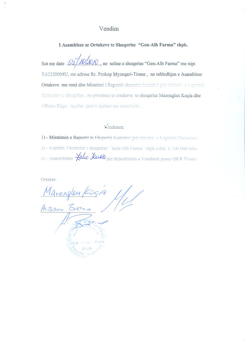 → Ekstrakti Historik i Regjistrit Tregtar date 22.07.2022 → Akt themelimi dhe Statuti i Shoqerise → Vendim i Asamblese se Ortakeve, Zmadhim Kapitali date 25.10.2010 → Vendim i Asamblese se Ortakeve, Zmadhim Kapitali date 30.09.2014 → Vendim i Asamblese se Ortakeve, Zmadhim Kapitali date 01.07.2016 → Ekstrakt historik i regjistrit tregtar date 04.08.2025 |