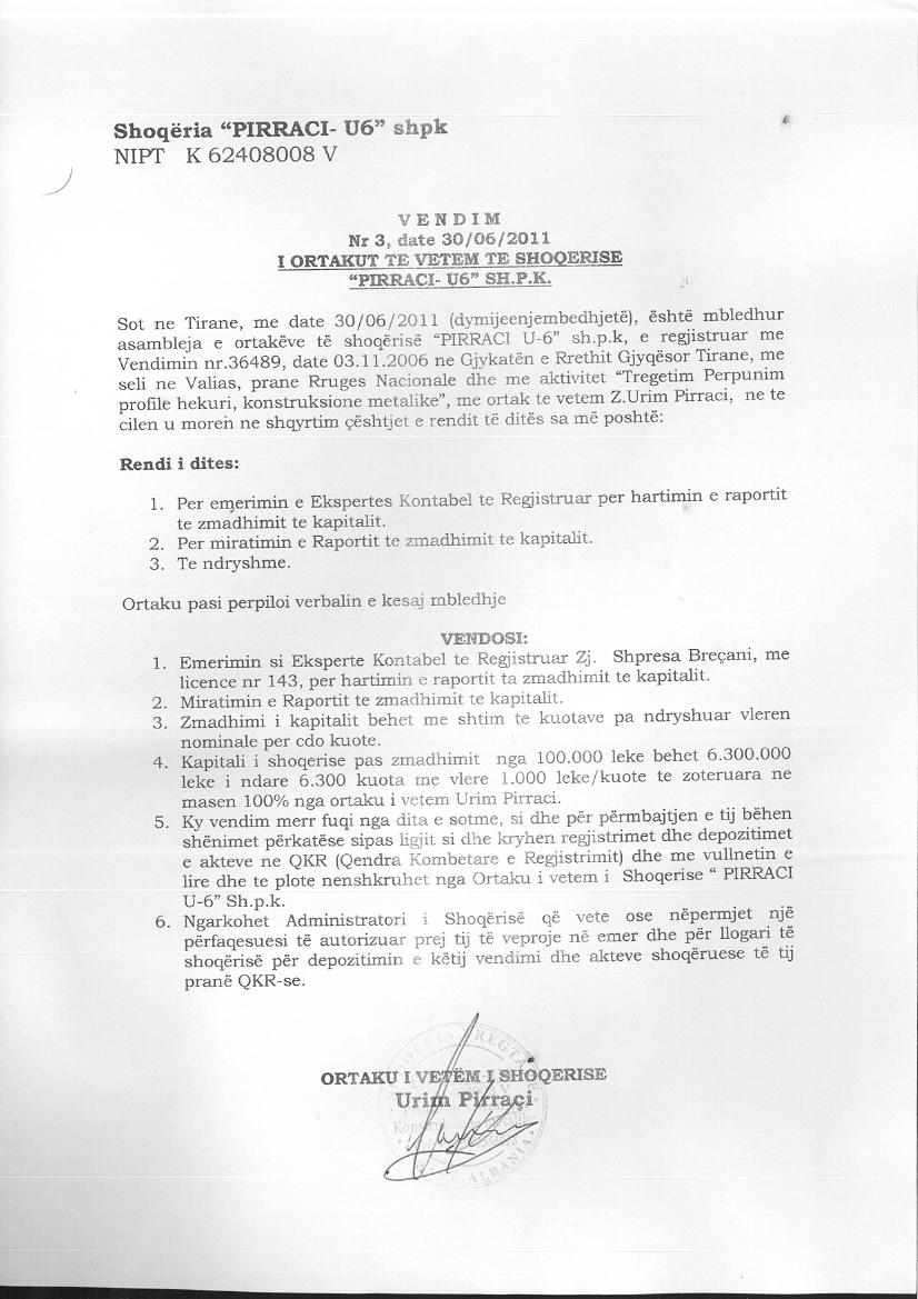 → Akti i themelimit dhe statuti → Ekstrakt historik i regjistrit tregtar 26.06.2021 → Vendim i ortakut te vetem per zmadhimin e kapitalit date 20.12.2018 → Vendim i ortakut te vetem per zmadhimin e kapitalit date 30.06.2011 → Vendim i ortakut te vetem per zmadhimin e kapitalit date 19.12.2016 → Vendim i ortakut te vetem per zmadhimin e kapitalit date 27.06.2013 |