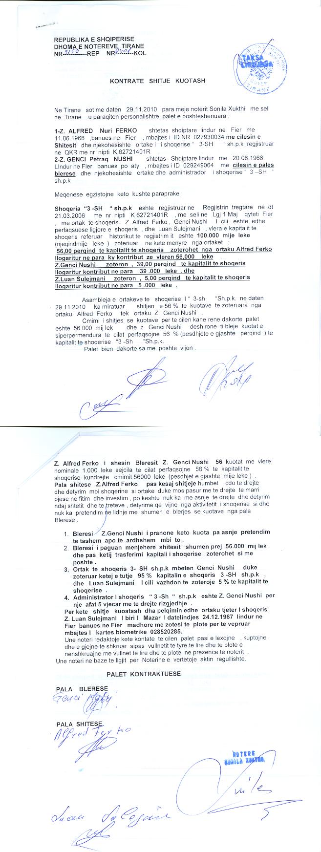 → Ekstrakt historik i regjistrit tregtar date 16.11.2021 → Akti i themelimit dhe statuti → Kontrate shitje kuotash date 29.11.2010 |