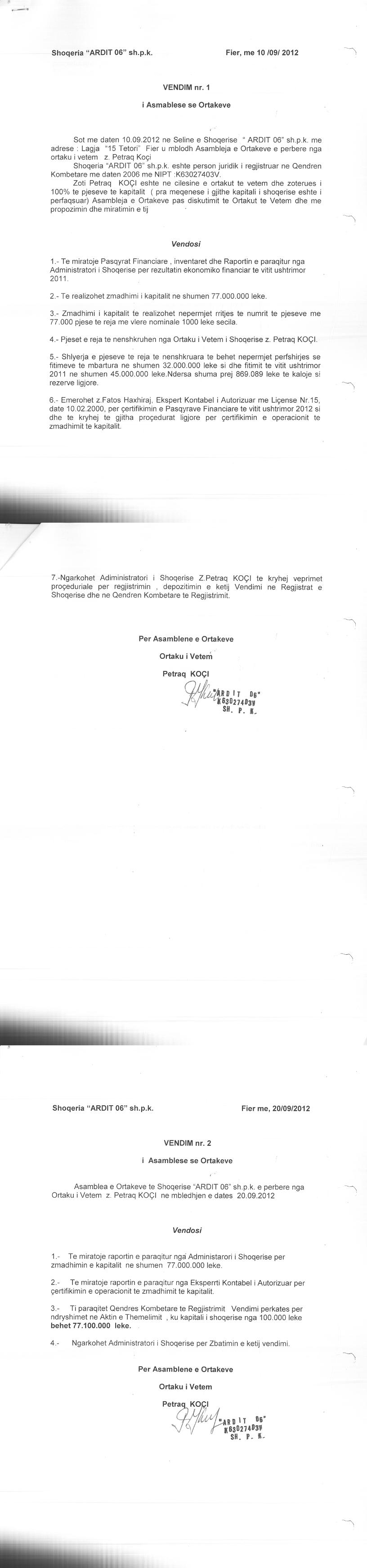 → Ekstrakt historik i regjistrit tregtar date 01.11.2021 → Akti i themelimit → Vendimi i asamblese se ortakeve per zmadhimin e kapitalit date 10.09.2012 → Vendimi i asamblese se ortakeve per zmadhimin e kapitalit date 25.06.2021 → Ekstrakt Historik i Regjistrit Tregtar date 17.06.2025 |