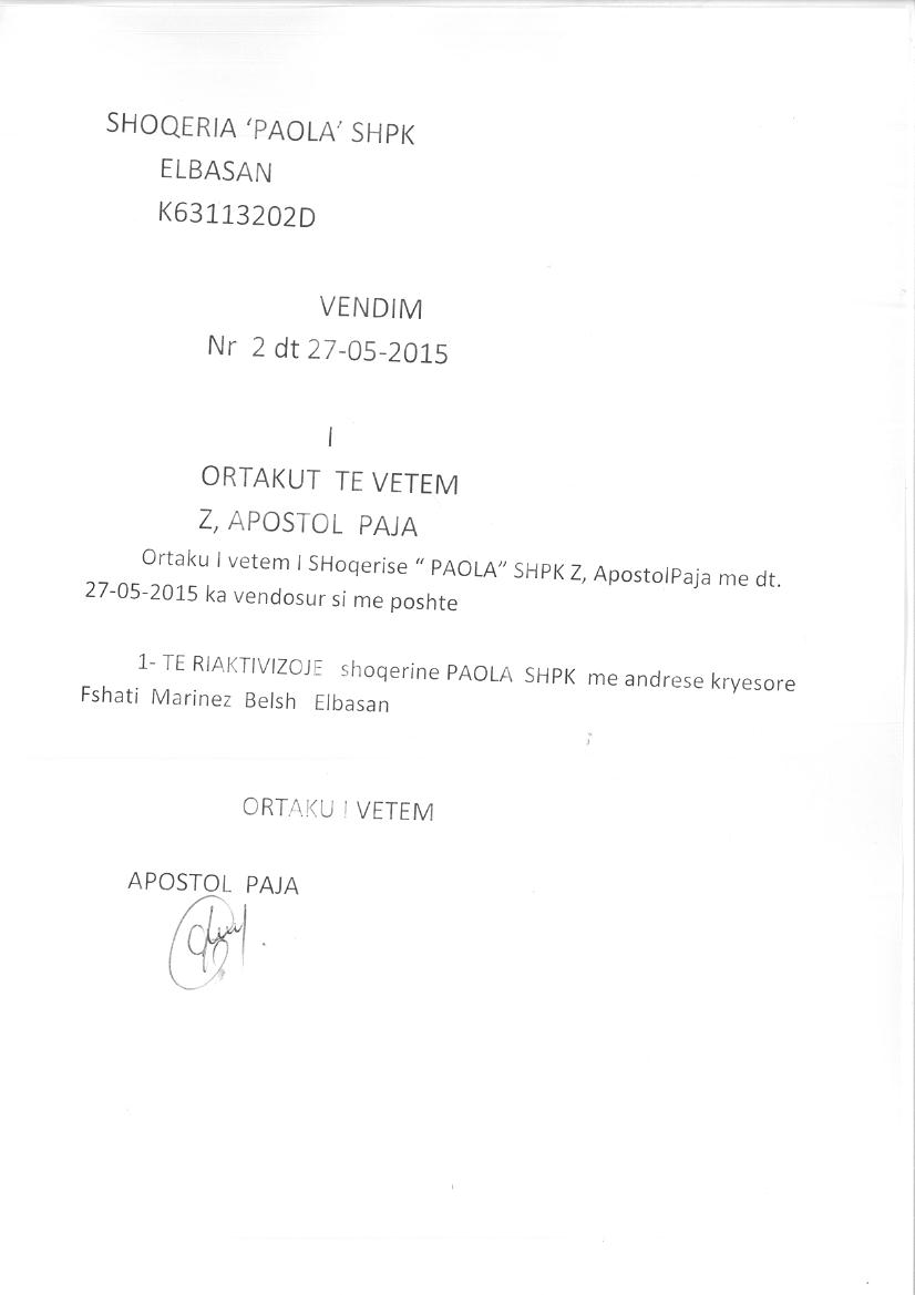 | Çështje Ligjore: | I. Më datë 20.11.2014, me vendim të ortakut të vetëm, u kërkua pezullimi i përkohshëm i aktivitetit të shoqërisë për një periudhë të pacaktuar për arsye të mungesës së aktivitetit ekonomik. Statusi i shoqërisë ndryshoi nga “Aktiv” në “Pezulluar”. II. Më datë 27.05.2015, me vendim të ortakut të vetëm, u riaktivizua veprimtaria e shoqërisë “Paola” shpk. Statusi i shoqërisë ndryshoi nga “Pezulluar” në “Aktiv”. III. Më datë 14.09.2018, me anë të Urdhrit Nr. 4327 Prot, Nr. 122-18 Regj "Urdhër për Vendosjen e Sekuestros Konservative", lëshuar nga Shërbimi Përmbarimor Astrea, protokolluar nga QKB me Nr. 10500 Prot, datë 17.09.2018, u urdhërua Qendra Kombëtare e Regjistrimit të vendosë sekuestro konservative mbi aktivet e shoqërisë "Paola" shpk, deri në një njoftim të dytë të përmbaruesit gjyqësor. Objekt i sekuestros jane detyrimet e papaguara ndaj kreditorit, Inspektoriati Shtetëror Teknik dhe Industrial. IV. Më datë 08.11.2018, me anë të Urdhrit Nr. 4692 Prot., Nr. 122-18 Regj "Urdhër për Heqjen e Sekuestros Konservative", lëshuar nga Shërbimi Përmbarimor “Astrea”, protokolluar nga QKB me Nr.12763 Prot, datë 09.11.2018, u urdhërua heqja e masës së sekuestros konservative të vendosur me anë të Urdhrit Nr. 4327 Prot, datë 14.09.2018, mbi aktivet e shoqërisë "Paola" shpk. |