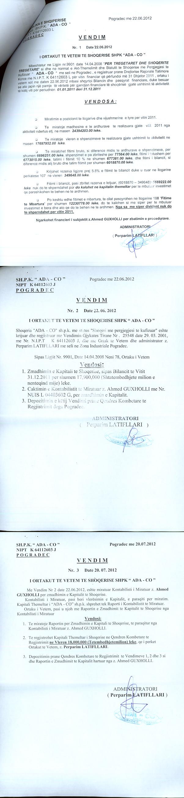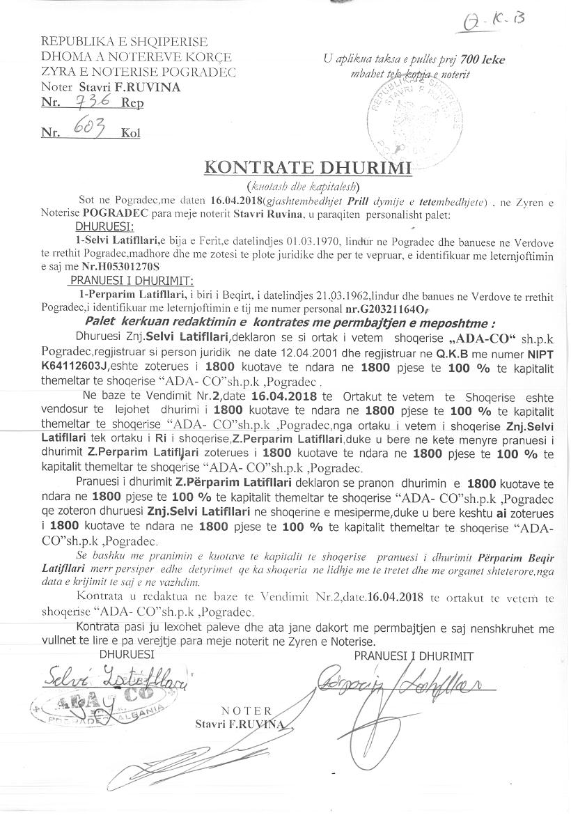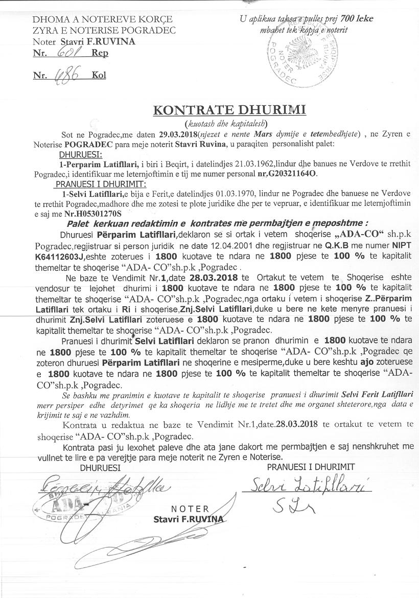 → Ekstrakt historik i regjistrit tregtar 05.07.2021 → Akti i themelimit → Kontrate dhurimi kuotash date 16.04.2018 → Kontrate dhurimi kuotash dhe kapitalesh date 29.03.2018 → Vendim i ortakut te vetem per zmadhimin e kapitalit date 22.06.2012 → Ekstrakt historik i regjistrit tregtar date 04.08.2025 |