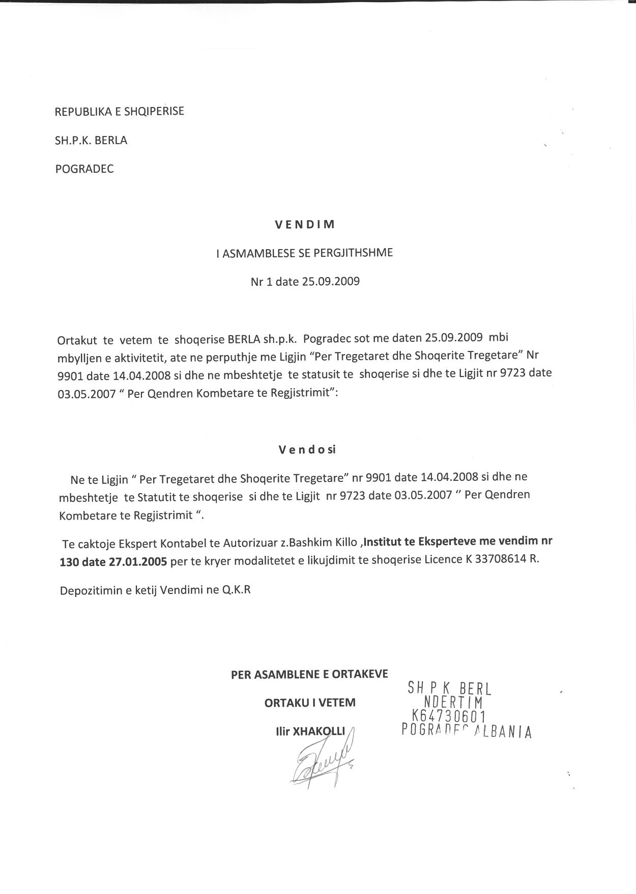 → Ekstrakti Historik i Regjistrit Tregtar date 23.05.2023 → Akt themelimi dhe Statuti i Shoqerise → Vendim i Ortakut te Vetem, Likuidim Shoqerie date 25.09.2009 → Vendim i Ortakut te Vetem, Cregjistrim Shoqerie date 30.11.2009 |
