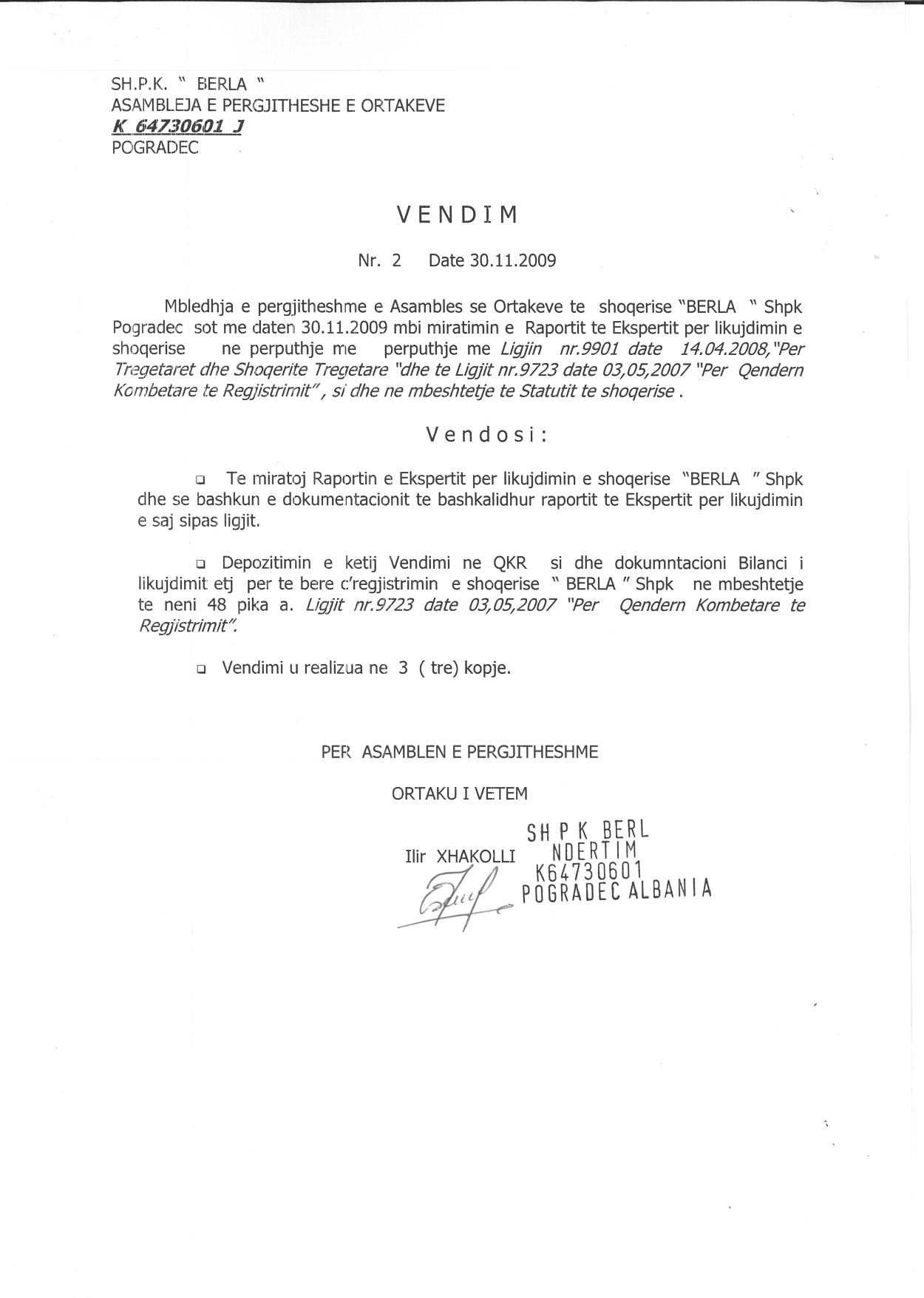 | Shënime: | I. Me date 25.09.2009, me vendim te ortakut te vetem, emerohet likuiduesi i shoqerise Bashkim Killo. II. Me date 30.11.2009, me vendim te ortakut te vetem, largohet likuiduesi i shoqerise Bashkim Killo. |