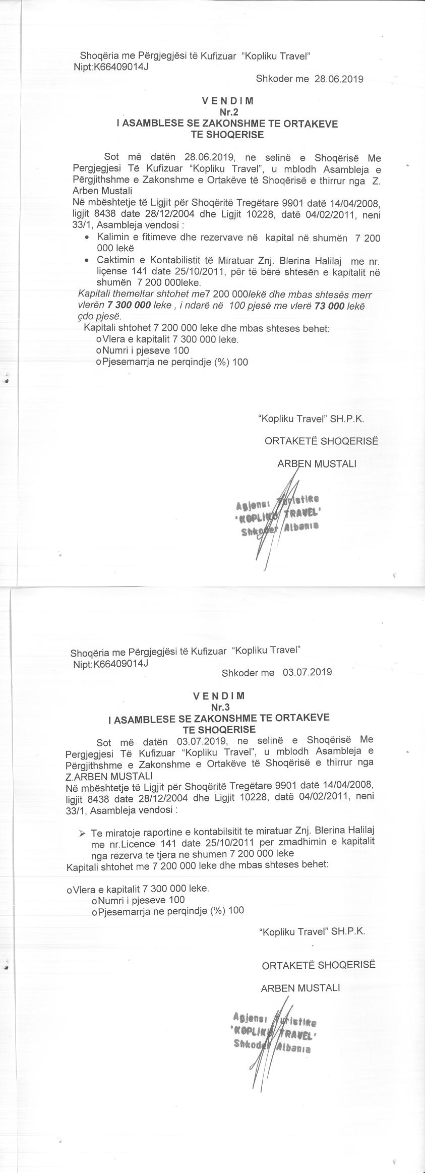 → Ekstrakt Historik i Regjistrit Tregtar date 01.03.2023 → Akt themelimi dhe Statuti i Shoqerise → Vendim i Ortakut te Vetem, Zmadhim Kapitali date 03.07.2019 |