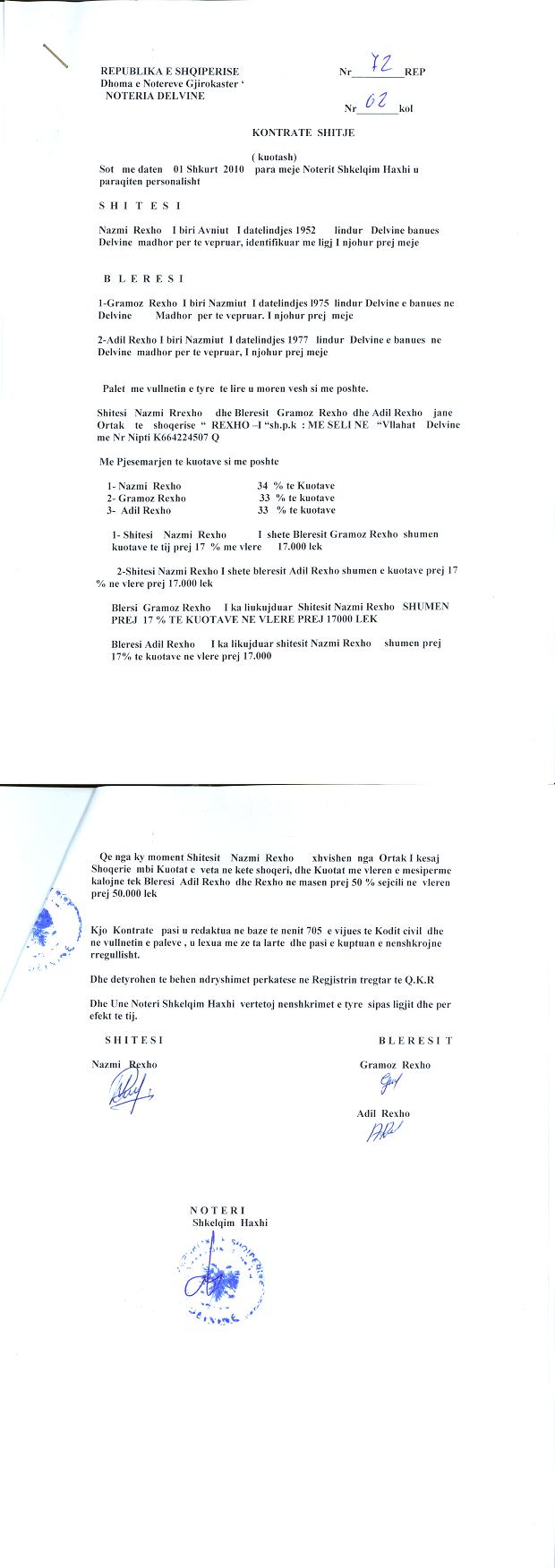 → Ekstrakt historik i regjistrit tregtar date 30.12.2021 → akti i themelimit → Kontrate shitje kuotash date 01.02.2010 → Ekstrakt Historik i Regjistrit Tregtar date 16.10.2023 → Ekstrakt Historik i Regjistrit Tregtar date 17.04.2024 → Të dhënat e Investimit, Financimet Nga IPARD - Aksesuar nga Agjencia për Zhvillim Bujqësor dhe Rural AZHBR datë 17.04.2024 |