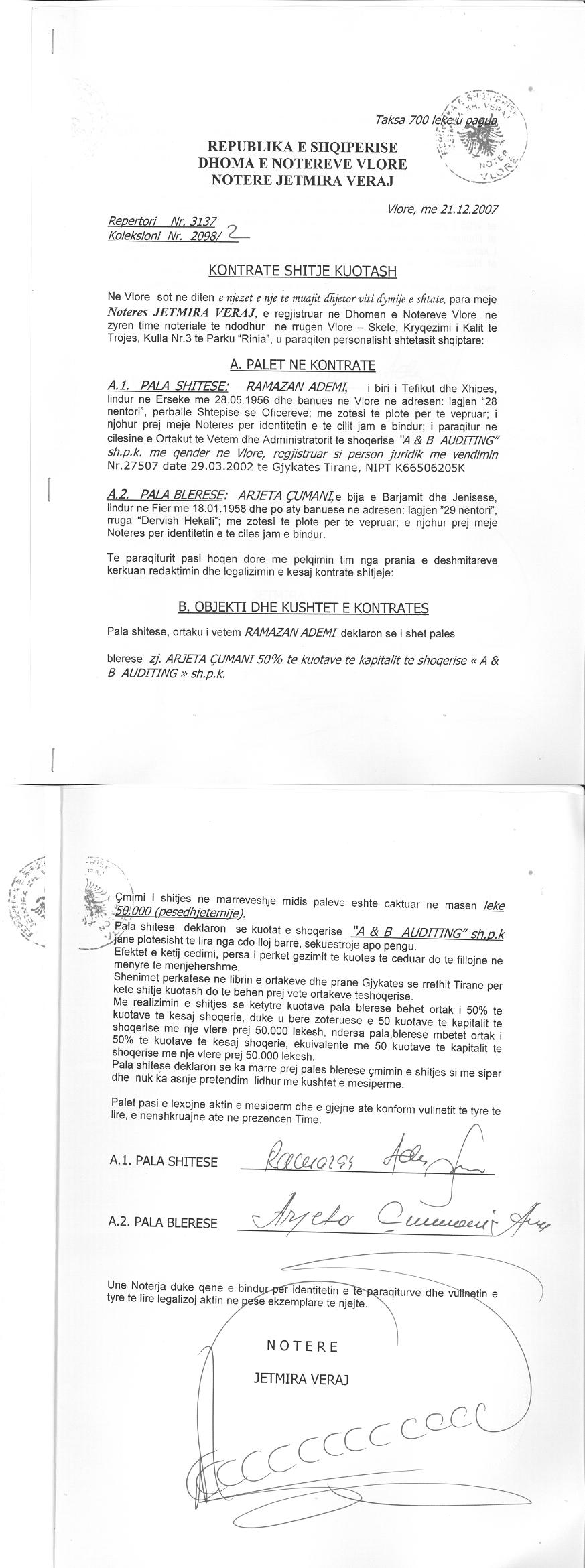 → Ekstrakt Historik i Regjistrit Tregtar date 03.03.2023 → Akt themelimi dhe Statuti i Shoqerise → Kontrate Shitje Kuotash date 17.01.2006 → Kontrate Shitje Kuotash date 21.12.2007 → Kontrate Shitje Kuotash date 03.03.2011 |