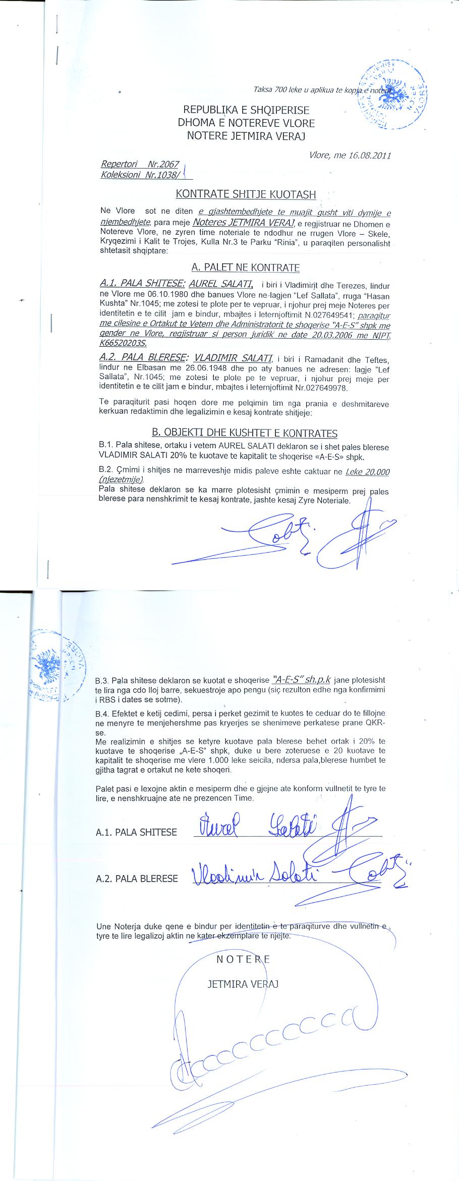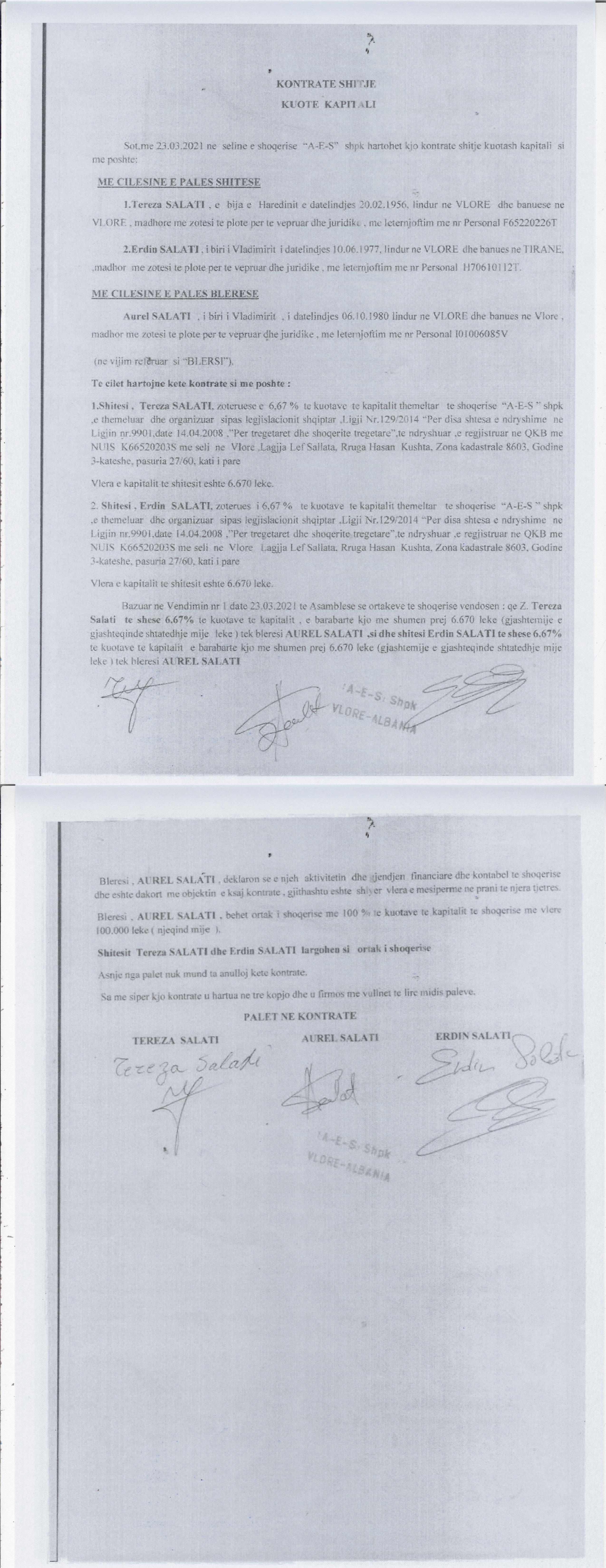 → Ekstrakt historik i regjistrit tregtar date 18.11.2021 → Akti i themelimit dhe statuti → Kontrate shitje kuotash kapitali date 23.03.2021 → Kontrate shitje kuotash date 16.08.2011 → Deshmi e trashegimise ligjore date 11.03.2021 |