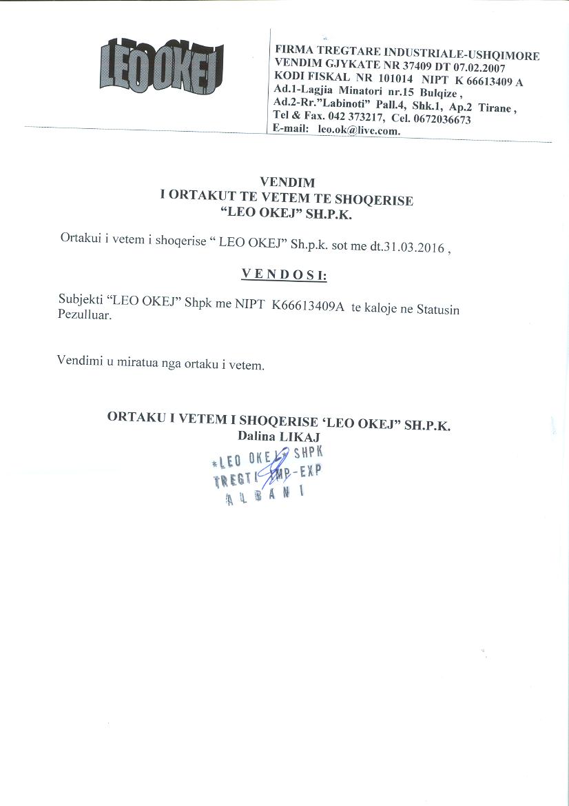 | Çështje Ligjore: | I. Me date 31.03.2016, me vendim te asamblese se ortakeve, u pezullua perkohesisht aktiviteti i shoqerise. Statusi ndryshoi nga: “Aktiv” ne “Pezulluar”. II. Me date 01.08.2019, me vendim te ortakut te vetem, u aktivizua veprimtaria e shoqerise. Statusi u kthye ne “Aktiv”. III. Me date 25.08.2021, u pezullua aktiviteti i shoqerise. Statusi ndryshoi nga: “Aktiv” ne “Pezulluar”. |