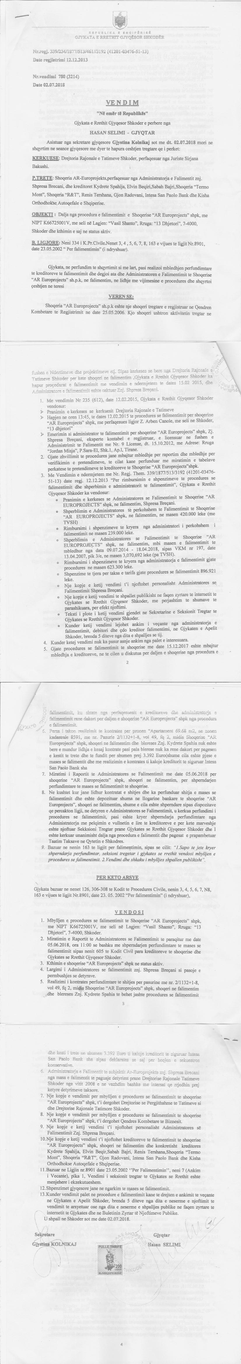 deri ne nje urdherese te dyte. II. Me datë 23.07.2013, me anë të Urdherit Nr.51/4 Prot., leshuar nga Zyra e Permbaruesit Gjyqesor HELIDON XHINDI, u kërkua: "Vendosja e masës së sekuestros konservative mbi aktivet e palës debitore Shoqëria “AR EUROPROJECTS” sh.p.k., me NUIS(NIPT)- K66725001V, me selin e Shkoder. Aktivet do te qendrojne te sekuestruara deri ne nje urdherese te dyte”. III. Me datë 20.05.2024, me anë të shkresës Nr. 2229 /3 Prot., për “Kërkesë për Vendosje të Masës së Sigurimit të Detyrimit Tatimor”, lëshuar nga Drejtoria e Përgjithshme e Tatimeve, Rajoni Verior, u kërkua: Vendosje të masës së sigurimit të detyrimit tatimor të tatimpaguesit shoqëria “ AR EUROPROJECTS “ SH.P.K., pajisur me NUIS (Nipt)- K66725001V . Vendosja e kësaj masë synon të moslejohet tjetërsimi i titujve të pronësisë dhe të drejtat pasurore që i përkasin këtij tatimpaguesit deri në shlyerjen e detyrimeve tatimore. Procedurë Falimenti I. Me datë 12.02.2015, me Vendim të Gjykatës së Rrethit Gjyqësor Shkodër, u miratua pranimi i kërkesës për Hapjen e Procedurës së Falimentit per shoqerine "AR EUROPROJECTS" sh.p.k, ne oren 13:45 te dates 12.02.2015. Si administrator te falimentit per shoqerine "AR EUROPROJECTS" sh.p.k u emërua Znj.Shpresa Dem Brecani. Statusi i shoqërisë ishte "Aktiv" u be "Shoqëri në procedurë falimenti". II. Me datë 02.07.2018, me Vendim te Gjykates se Rrethit Gjyqesor Shkoder, nr.780 (3214), u miratua mbyllja e procedures se falimentimit te shoqerise "AR EUROPROJECTS" sh.p.k me nipt- K66725001V. Kthimi i shoqerise "AR EUROPROJECTS" sh.p.k ne status aktiv. Statusi i shoqërisë ishte "Shoqëri në procedurë falimenti" u be "Aktiv". |