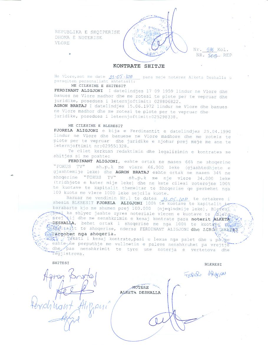 Service”, Nr. 4142/3, “Për vënien e sekuestros konservative”, u urdherua “Qendra Kombëtare e Regjistrimit - Tiranë, të vendosi masën e sekuestros konservative mbi aksionet e palës debitore TV Kabllor Fokus (“TV Fokus” sh.p.k., administrator Fjorela Aligjoni, me NIPT K67225203N), me qëllim pengimin e ndryshimit të statusit dhe shitjen e kuotave të shoqërisë debitore, për arsye se debitori i shmanget shlyerjes së detyrimit. II. Me datë 21.12.2015, me ane te Urdherit, Nr.80 Prot, Nr. 18 Dosje, protokolluar nga QKR, me Nr. 11549 Prot, lëshuar nga Studio permbarimore “ Andi Kocaqi ”, u urdherua vendosja e sekuestros ne aktivet e debitorit “Fokus T.V” shpk, me NUIS K67225203N dhe znj. Fjirela Aligjoni deri ne nje urdher te dyte. III. Me datë 07.01.2016, me ane te Urdherit Nr. 4314/4 Prot., protokolluar nga QKR me Nr.291 Prot., date 12.01.2016, lëshuar nga Shoqeria Permbarimore Private “Hoti Bailiff Service u urdherua vendosja e mases se sekuestros konservative mbi aksionet e pales debitore Tv Fokus (Tv Fokus shpk, me administrator Fjorela Aligjoni, me Nipt-K67225203N), me qellim pengimin dhe ndryshimin e statusit dhe shitjen e kuotave te pales debitore, per arsye se debitori I shmanget shlyerjes se detyrimit. IV. Me date 18.09.2017, me ane te Urdherit Nr.455 Prot, lëshuar nga shoqeria permbarimore B.S.E BAILIFF SERVICE EXECUTIVE SHPK , protokolluar nga QKB me Nr.13580 Prot., datë 21.09.2017, u urdherua heqja e masës së sekuestros konservative mbi aktivet e shoqerise “Fokus T.V” shpk me NIPTK67225203N. V. Me date 04.12.2017, me ane te Urdherit Nr. 243 Dosje., Nr. 4733 Prot., protokolluar nga QKB me Nr.16749 Prot., date 04.12.2017 lëshuar nga Permbarues Privat Gjyqesor Elvin Hoxha, u urdhërua vendosja e mases se sekuestros konservative ne kuotat/aksionet e pales debitore shoqeria “FOKUS T.V.” sh.p.k., me NUIS (NIPT) - K67225203N autorizuar per subjektin kabllor “Tv Fokus” si dhe mbi te drejtat qe rrjedhin nga zoterimi i ketyre aksioneve/kuotave duke ndaluar tjetersimin dhe/ose disponimin e tyre si dhe mos kryerjen e asnje veprimi tjeter i cili mund te ndryshoje te dhenat e regjistrit tregtar si dhe duke ndaluar tjetersimin e Administratorit z. Ferdinant Aligjoni. Dokumentacioni do te qendroje i bllokuar deri ne nje urdher te dyte nga Permbarues Privat Gjyqesor Elvin Hoxha. VI. Me date 26.01.2018, me ane te Urdhrit Nr.519 Prot., protokolluar nga QKB me Nr.1001 Prot., date 29.01.2018, leshuar nga Permbarues Gjyqesor Elvin Hoxha, u urdherua vendosja e mases se sekuestros konservative ne aksionet, kuotat e pales debitore "FOKUS T.V." sh.p.k me Nipt-K67225203N autorizuar per subjektin kabllor "Tv Fikus", si dhe mbi te drejtat qe rrjedhin nga zoterimi i ketyre kuotave duke ndaluar tjetersimin dhe/ose disponimin e tyre si mos kryerjen e asnje veprimi tjeter, i cili mund te ndryshoje te dhenat e regjistrit tregtar si dhe duke ndaluar tjetersimin e administratorit z.Ferdinant Aligjoni. Dokumentacioni do te qendroje i bllokuar deri ne nje urdher te dyte deri ne nje urdher te dyte nga permbaruesi gjyqesor Elvin Hoxha. VII. Me date 02.08.2018, me vendim te ortakut te vetem, u vendos : Pezullimi i Aktivitetit. Statusi i Shoqerise kalon nga "Aktiv" ne "Pezulluar" VIII. Me datë 10.05.2019, me ane te Vendimit Nr.3580Prot., Nr.243,276 Dosje, protokolluar nga QKB me Nr. 6796., date 13.05.2019 leshuar nga Shoqeria Permbarimore "Bailiff Service E. Hoxha", drejtuar QKB, u vendos zhbllokimi nga masa e sekuestros konservative menjehere aksionet/kuotat e debitorit shoqeria "FOKUS T.V." sh.p.k me Nipt-K67225203N autorizuar per subjektin kabllor "Tv Fikus" me administrator Ferdinant Aligjoni, bllokuar me shkresen nr. 4733., date 04.12.2017 dhe shkresen nr,519 Prot., date 26.01.2017 te permbaruesit gjyqesor. |
