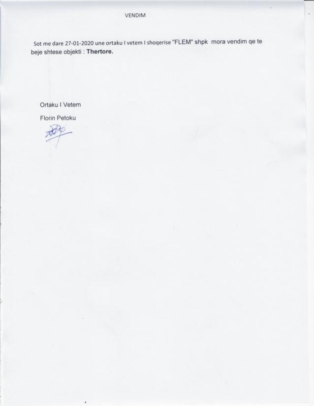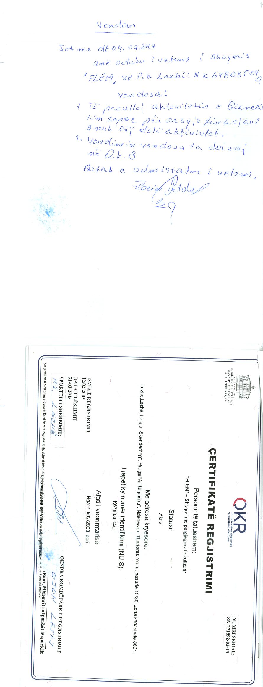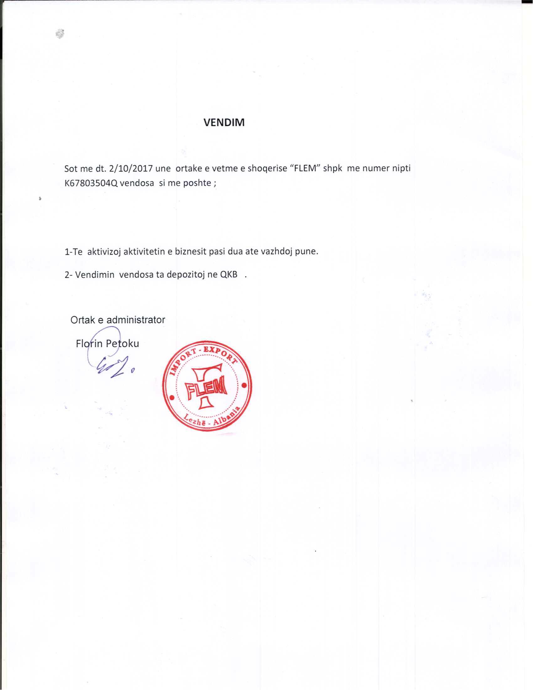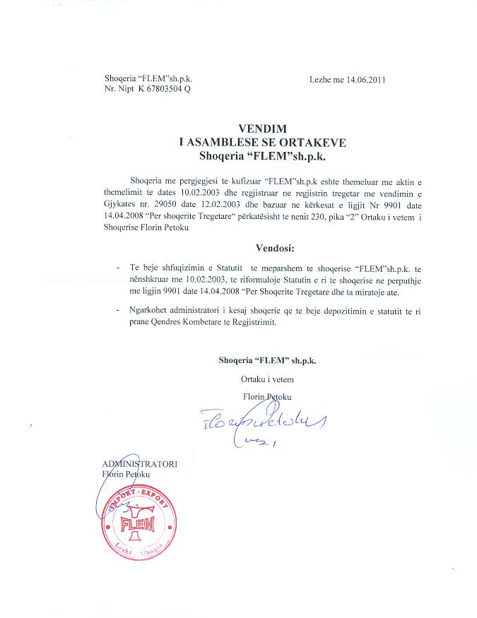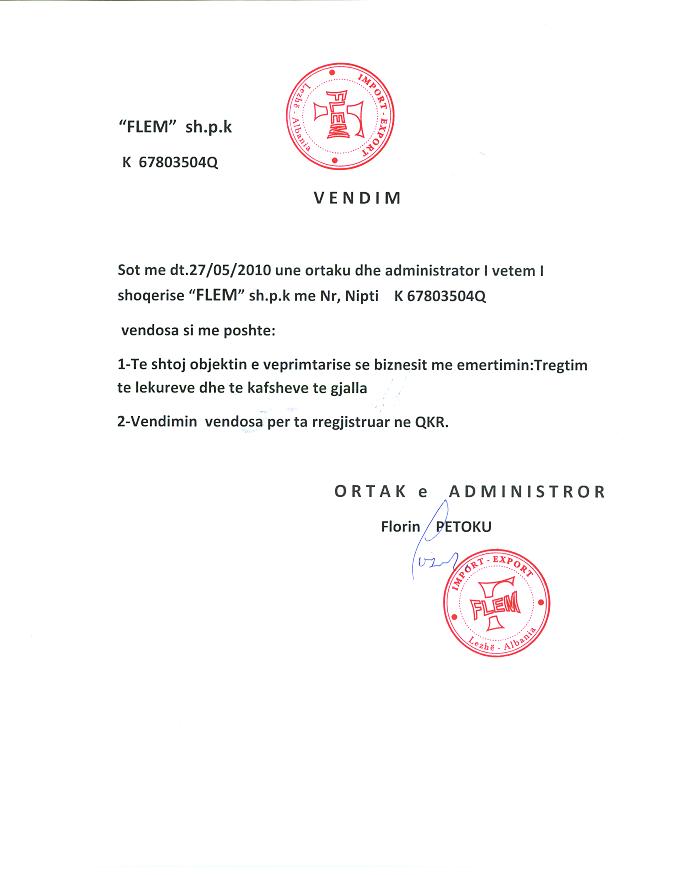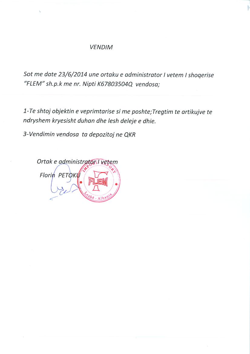 → Ekstrakt Historik i Regjistrit Tregtar, date 14.12.2021 → Vendimi i Ortakut te vetem, date 27.05.2010 → Vendimi i Ortakut te vetem, date 14.06.2011 → Vendimi i Ortakut te vetem , date 23.06.2014 → Vendimi i Ortakut te vetem, date 04.07.2017 → Vendimi i Ortakut te Vetem, date 2.10.2017 → Vendimi i Ortakut te Vetem, date 27.01.2020 |