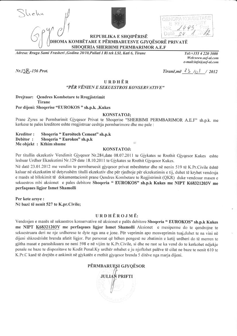 | Çështje Ligjore: | I. Më datë 23.01.2012, me anë të Urdhrit "Për Vënin e Sekuestros Konservative" Nr.158-456 Prot, të Shoqërisë Përmbarimore Private "Shoqëria Shërbimi Përmbarimor Privat A.E.F " shpk, u urdhërua QKR për vëndosjen e masës së sekuestros konservative në aksionet e palës debitore "EUROKOS" shpk, me përfaqësues ligjor Ismet Shamolli. Aksionet e mësipërme do të qëndrojnë të sekuestruara deri në një urdhëresë të dytë. Objekti i sekuestros është kthimi i shumës ndaj shoqërisë “Euroitech Cement” sh.p.k. II. Më datë 04.07.2014, me anë të Urdhrit Nr. 750 Prot, "Për Vënien e Sekuestros Konservative", lëshuar nga Shoqëria "E.G BAILIFF'S SERVICES", u urdhërua vendosja e masës së sekuestros konservative mbi të gjitha aksionet e zotëruara nga debitori, shoqëria "EUROKOS", për ekzekutimin e Titullit Ekzekutiv, Vendim Gjyqësor Nr.69, datë 01.04.2014 i Gjykatës së Rrethit Gjyqësor Kukës. Objekt i sekuestros është kthimi i shumës ndaj shoqërisë “Antea Cement” sha. III. Më datë 25.01.2017, me anë të Urdhrit Nr. 239/70 Prot, protokolluar nga QKB me Nr. 1178 Prot., datë 26.01.2017, lëshuar nga Shoqëria "Prestige Bailiff Services " sh.p.k, u urdhërua heqja e masës së sekuestros konservative mbi aksionet/kuotat e palës debitore "EUROKOS" shpk, me NUIS (NIPT) K68321203V dhe përfaqësues ligjor Ismet Shamolli. |