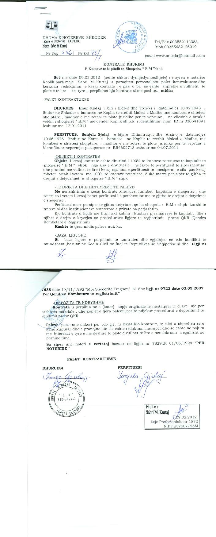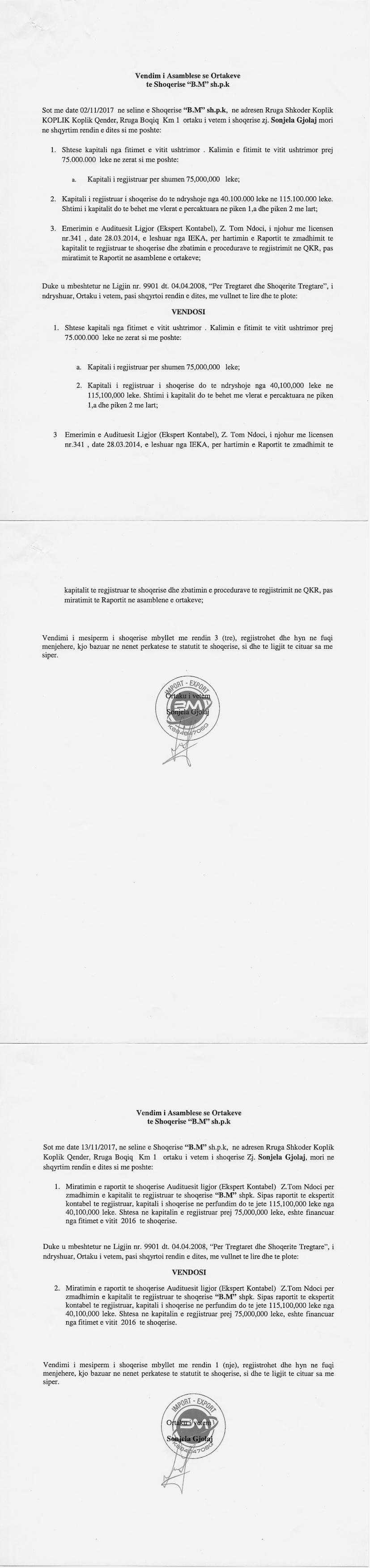 | Emërtime të tjera Tregtare: | "B.M" SHPK |